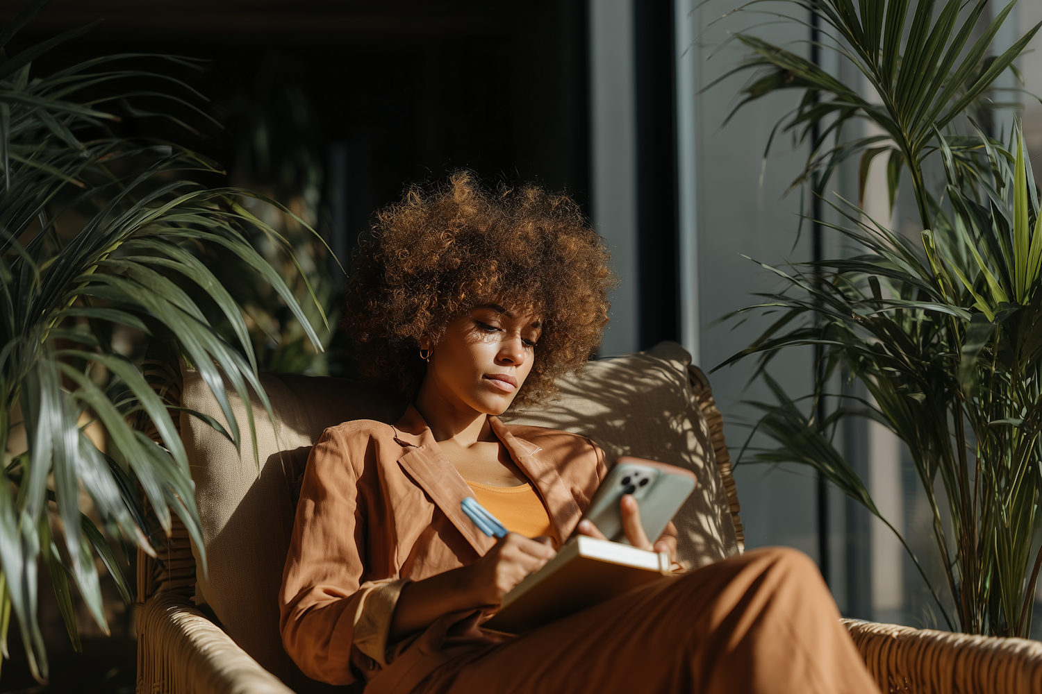 A woman sits in a cozy chair surrounded by plants, writing in a notebook while holding a smartphone, bathed in warm sunlight.
