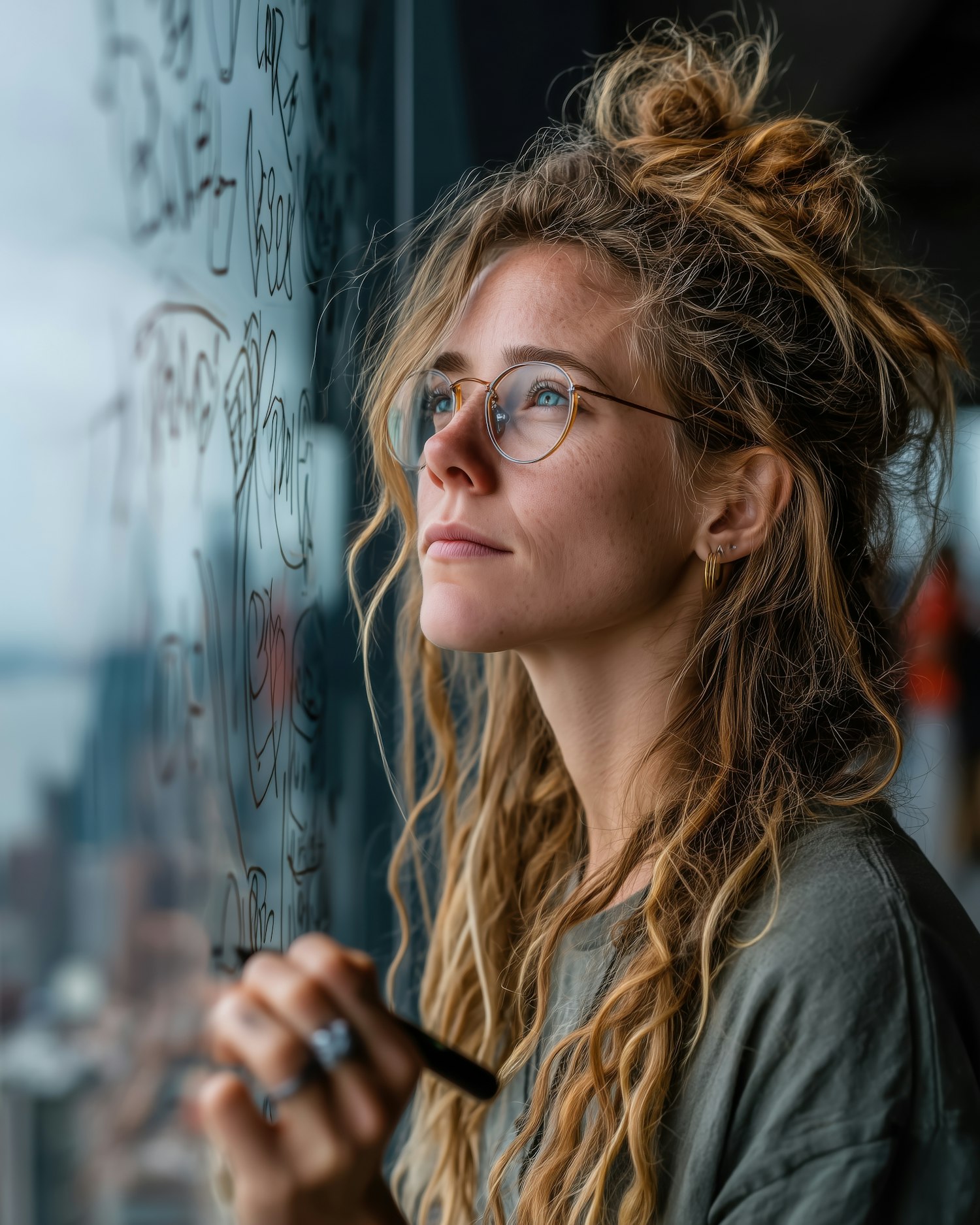 A thoughtful woman with wavy blonde hair and glasses writes on a glass board, with a blurred cityscape in the background.