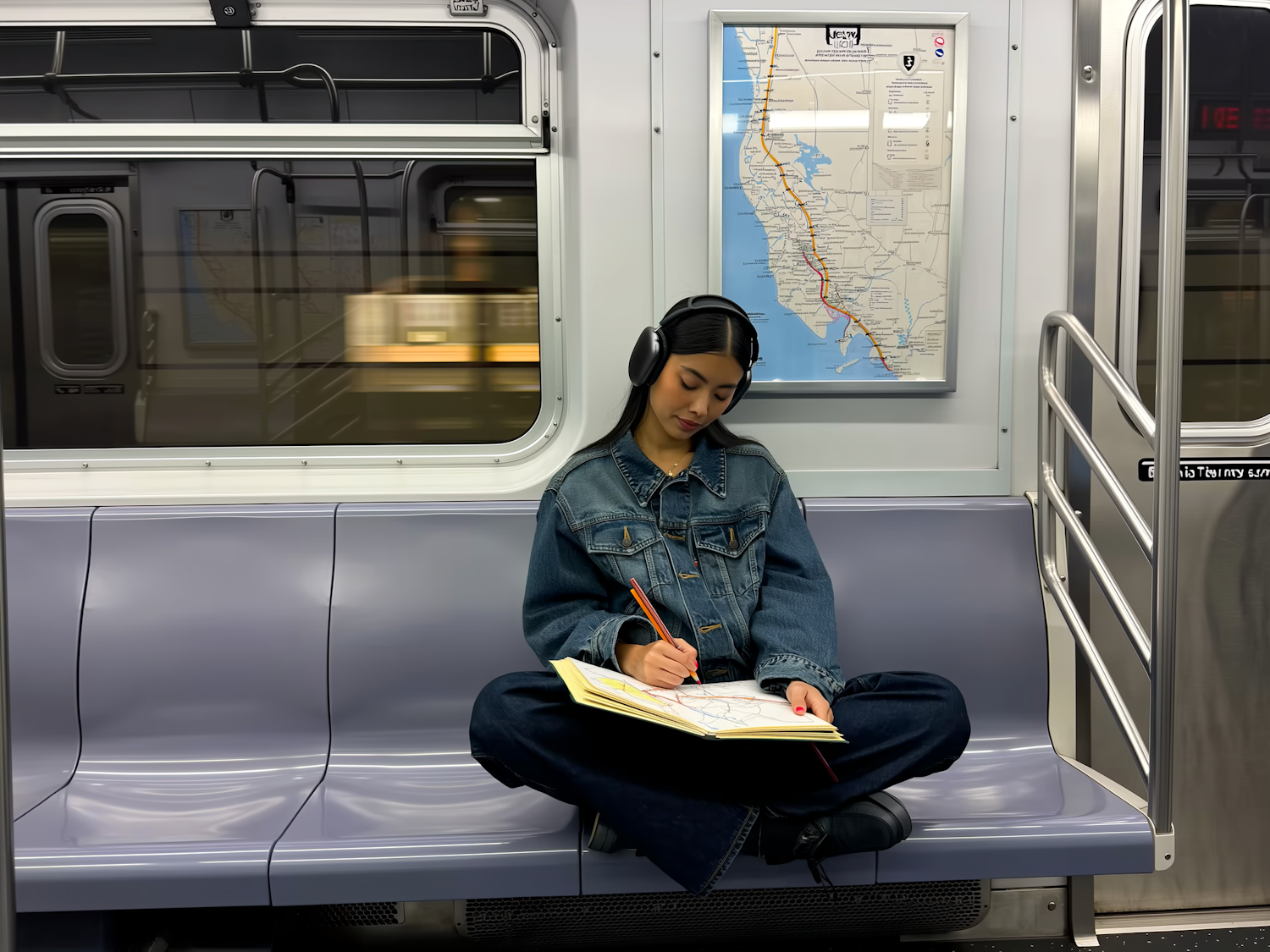 A young woman sits on a subway, wearing headphones and writing in a notebook. The subway map and passing train add a dynamic urban vibe.