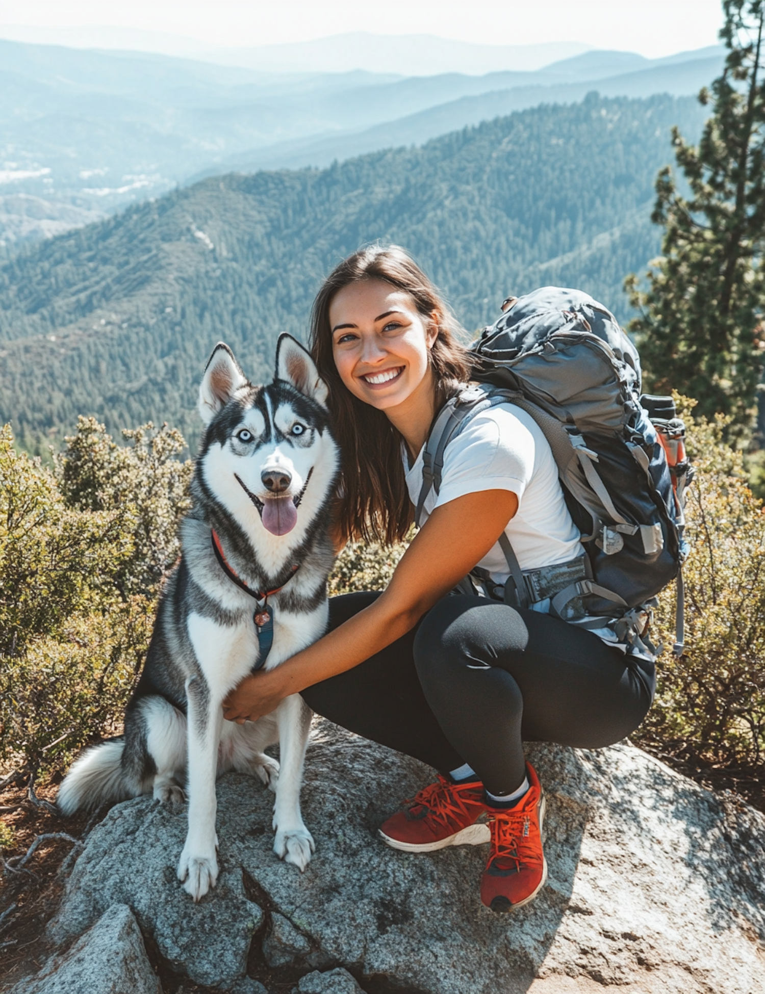Woman hiking with a Siberian Husky in scenic mountain landscape, wearing a backpack and red hiking shoes, under a clear blue sky.