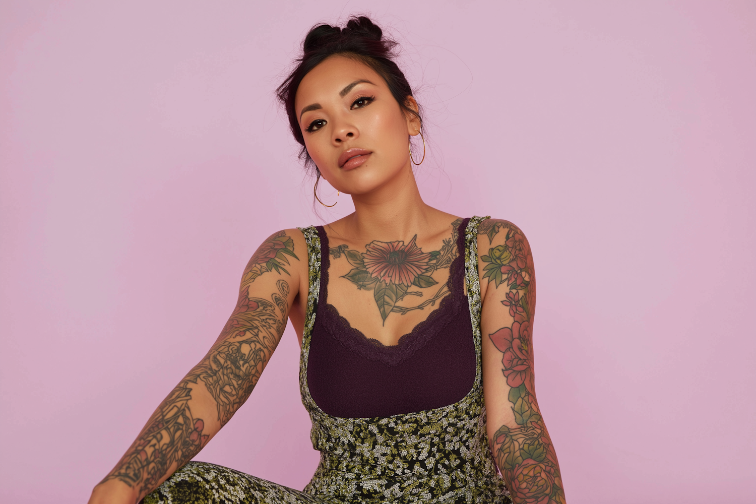 Stylish woman with floral tattoos sits against a pink background, wearing a patterned outfit and expressing confidence and creativity.