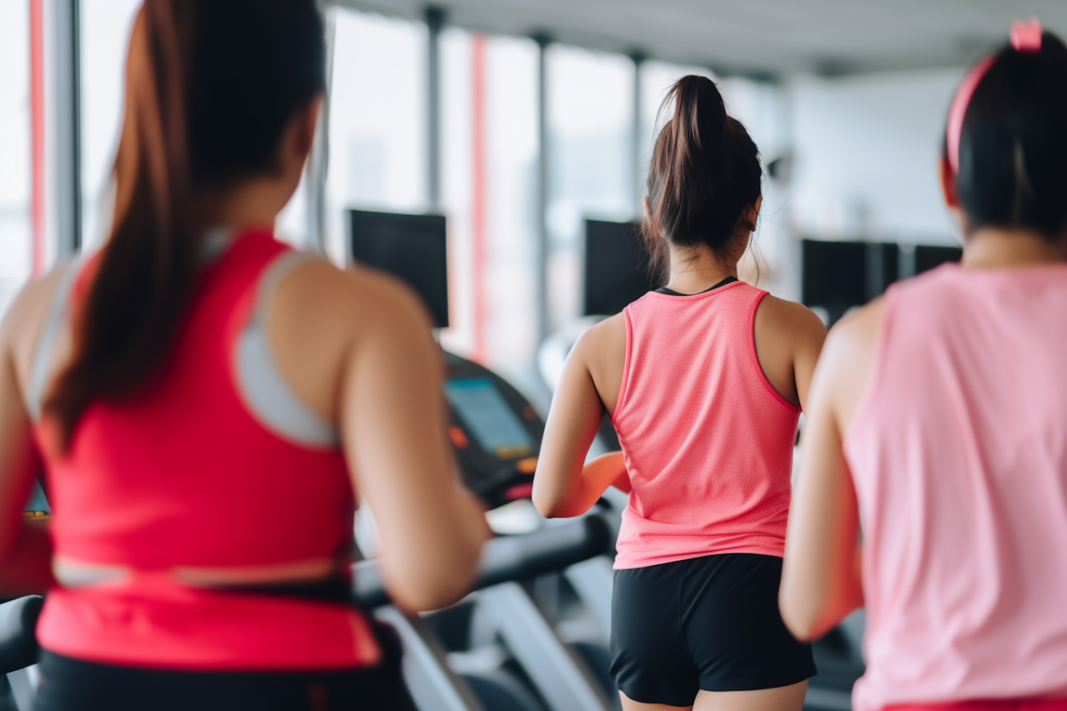 Three women in pink tops running on treadmills in a bright gym, showcasing fitness and camaraderie.