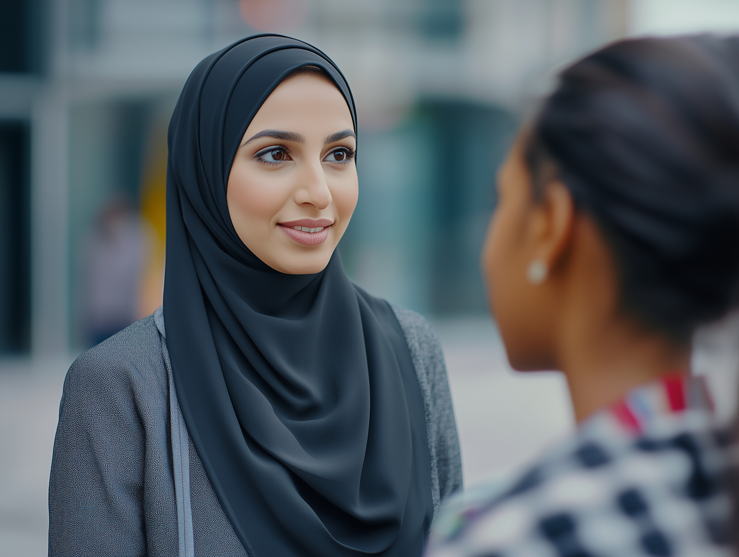 Two women engaged in conversation, one wearing a black hijab and gray blazer, the other in a colorful top, in an urban setting.