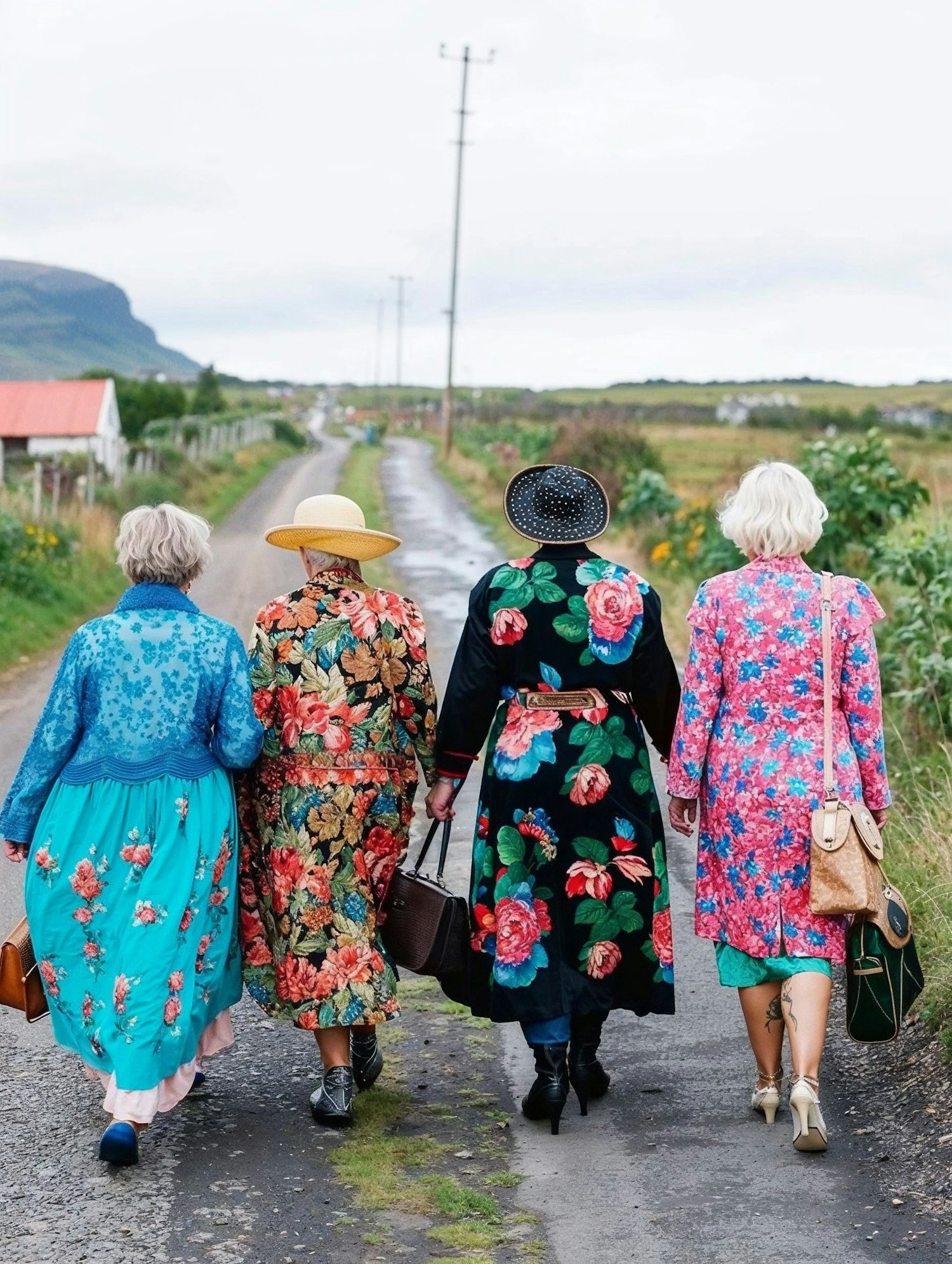 Four women in colorful floral dresses walk down a rural road, showcasing vibrant patterns and styles against a scenic backdrop.