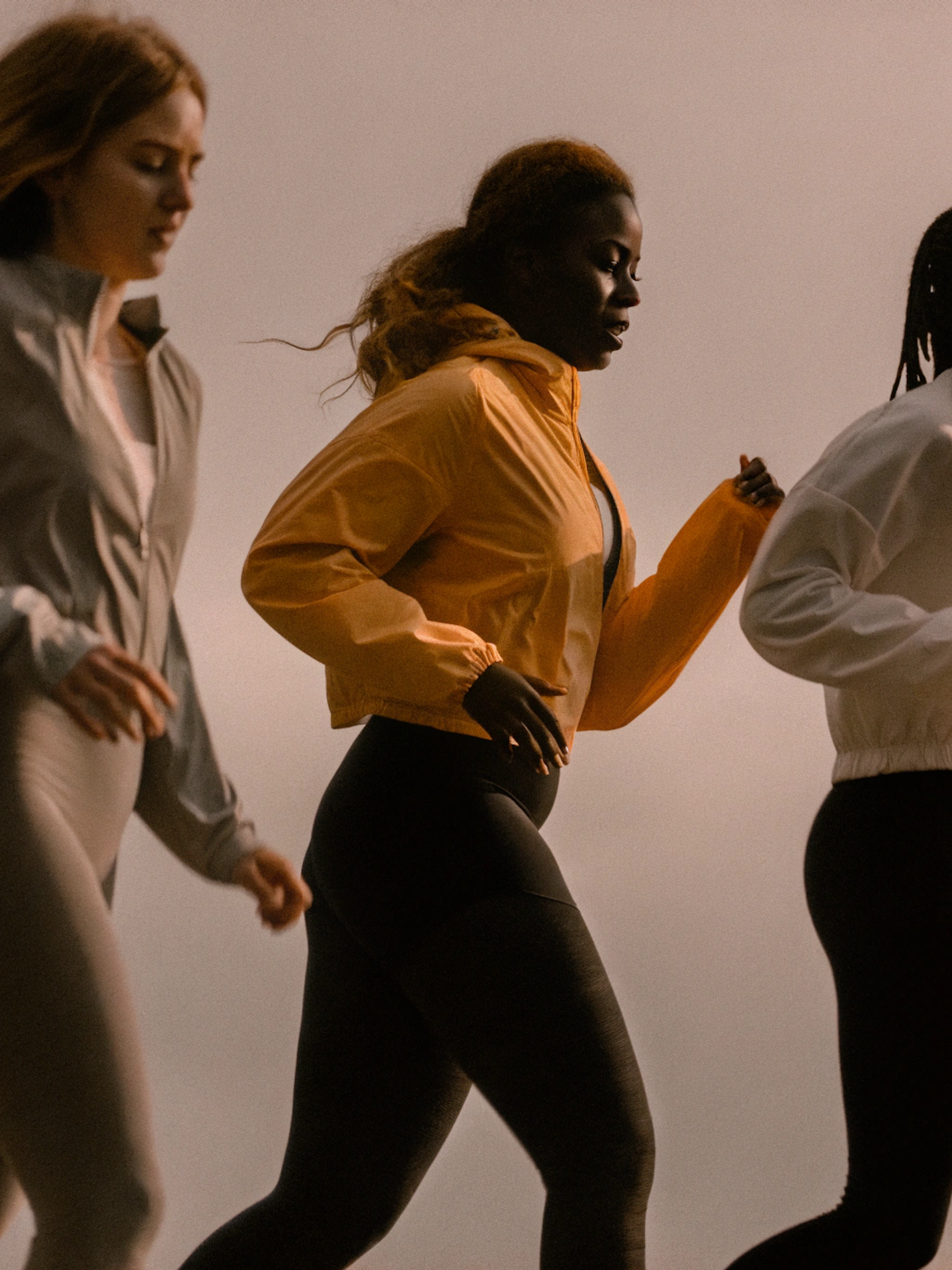 Three women jogging outdoors in stylish activewear, featuring bright and neutral tones, under soft, warm lighting.