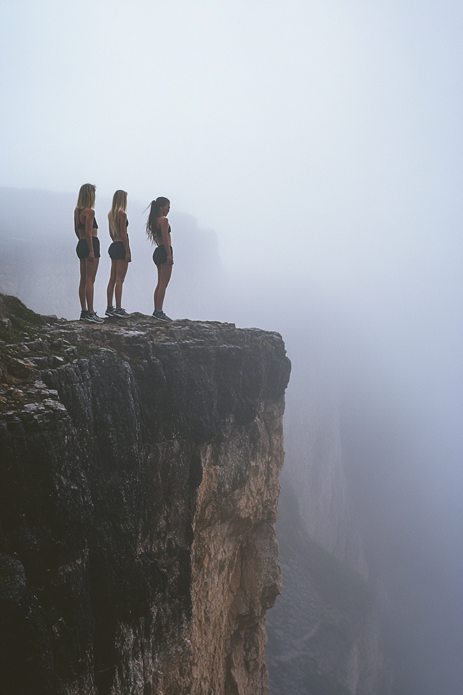 Three women in athletic wear stand on a foggy cliff edge, gazing into the mist. A scene of adventure and contemplation.