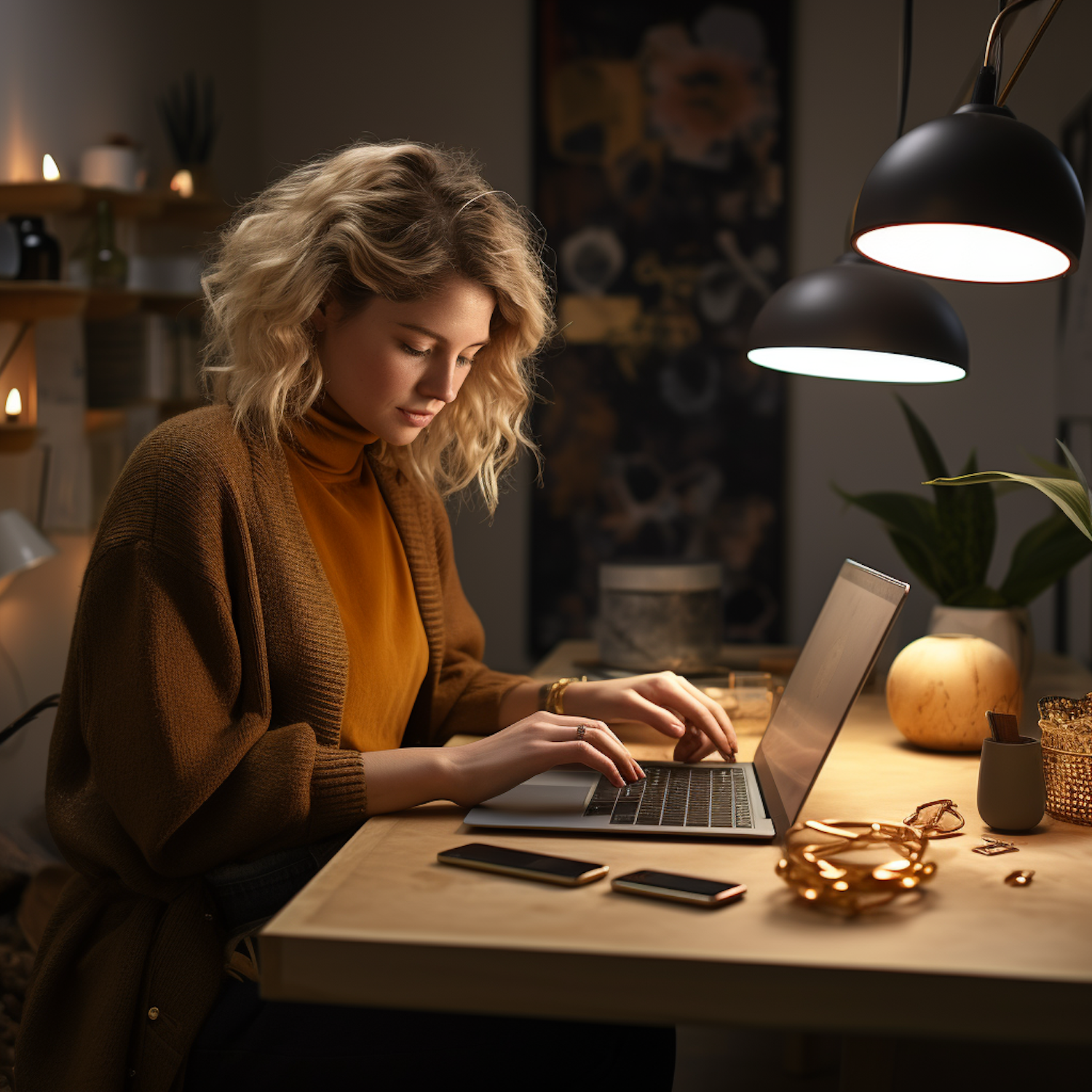 A woman in a cozy cardigan works on her laptop at a warmly lit desk, surrounded by phones and elegant decor.