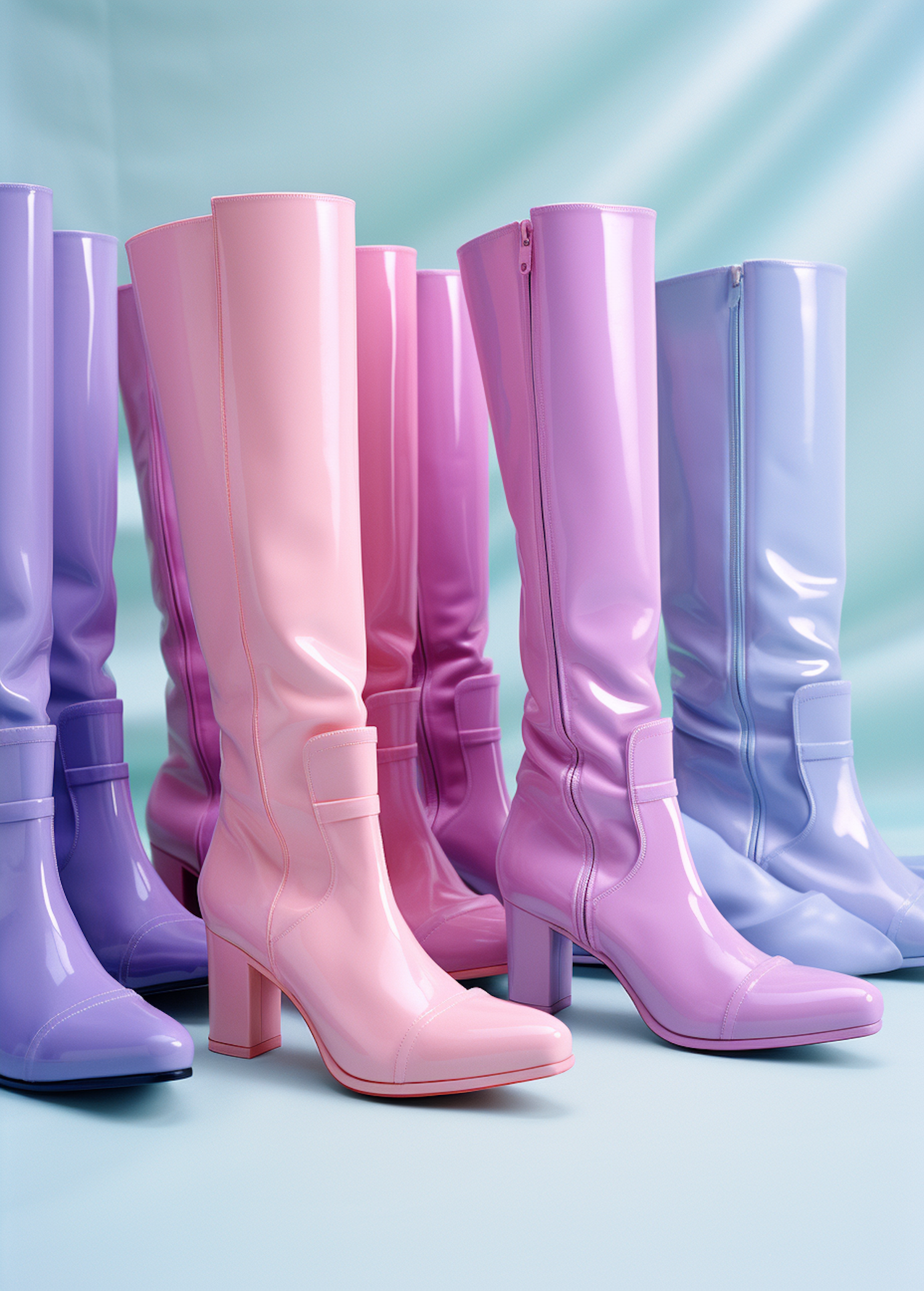 Stylish pastel high-heeled boots in pink, lavender, and blue with a glossy finish, arranged on a soft aqua background.