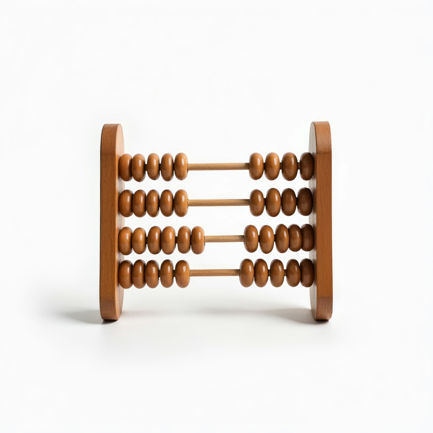Wooden abacus with four rods and smooth beads on a white background, showcasing a classic educational tool.