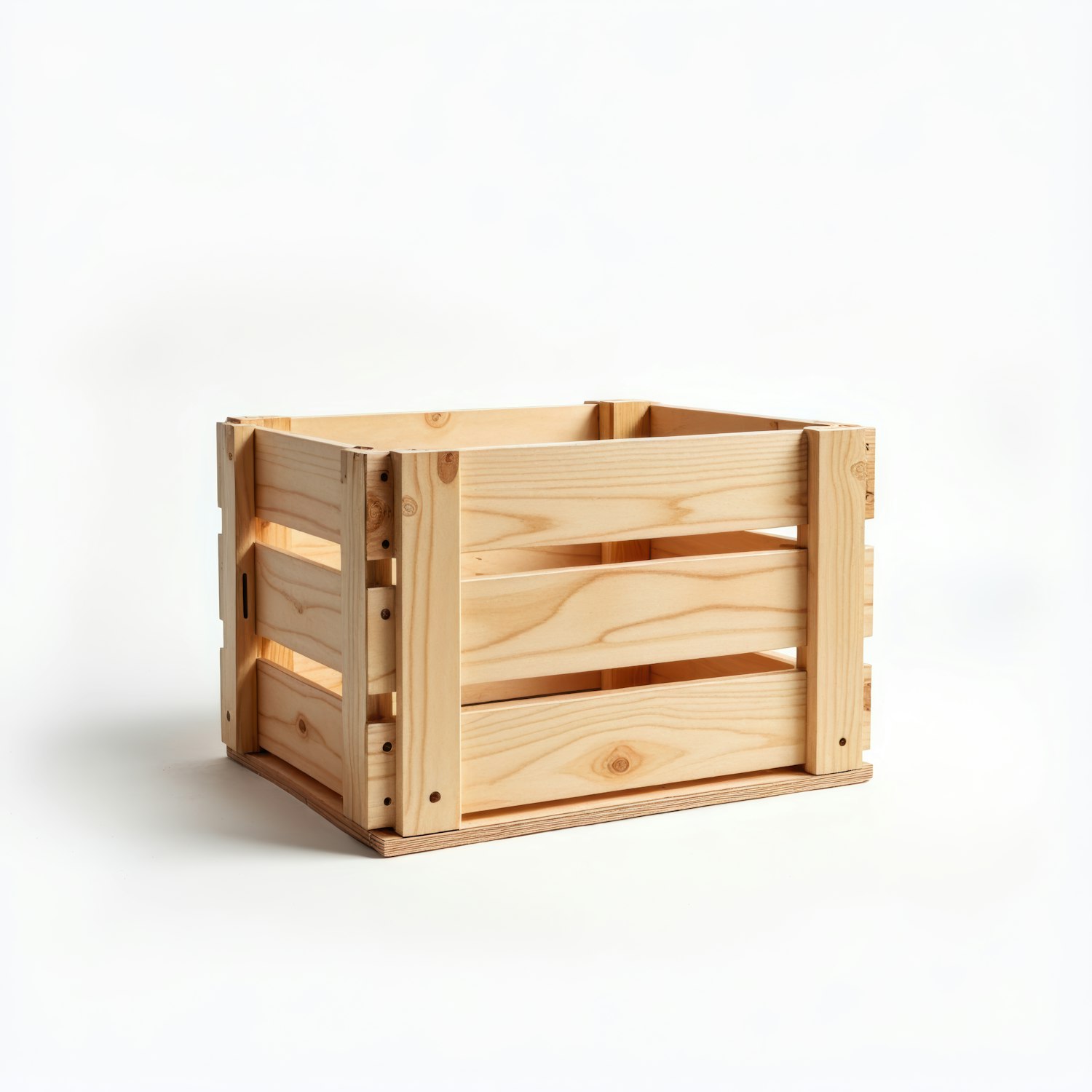 Wooden crate with slatted sides and natural finish, perfect for storage or decor. Simple, rustic design on a white background.