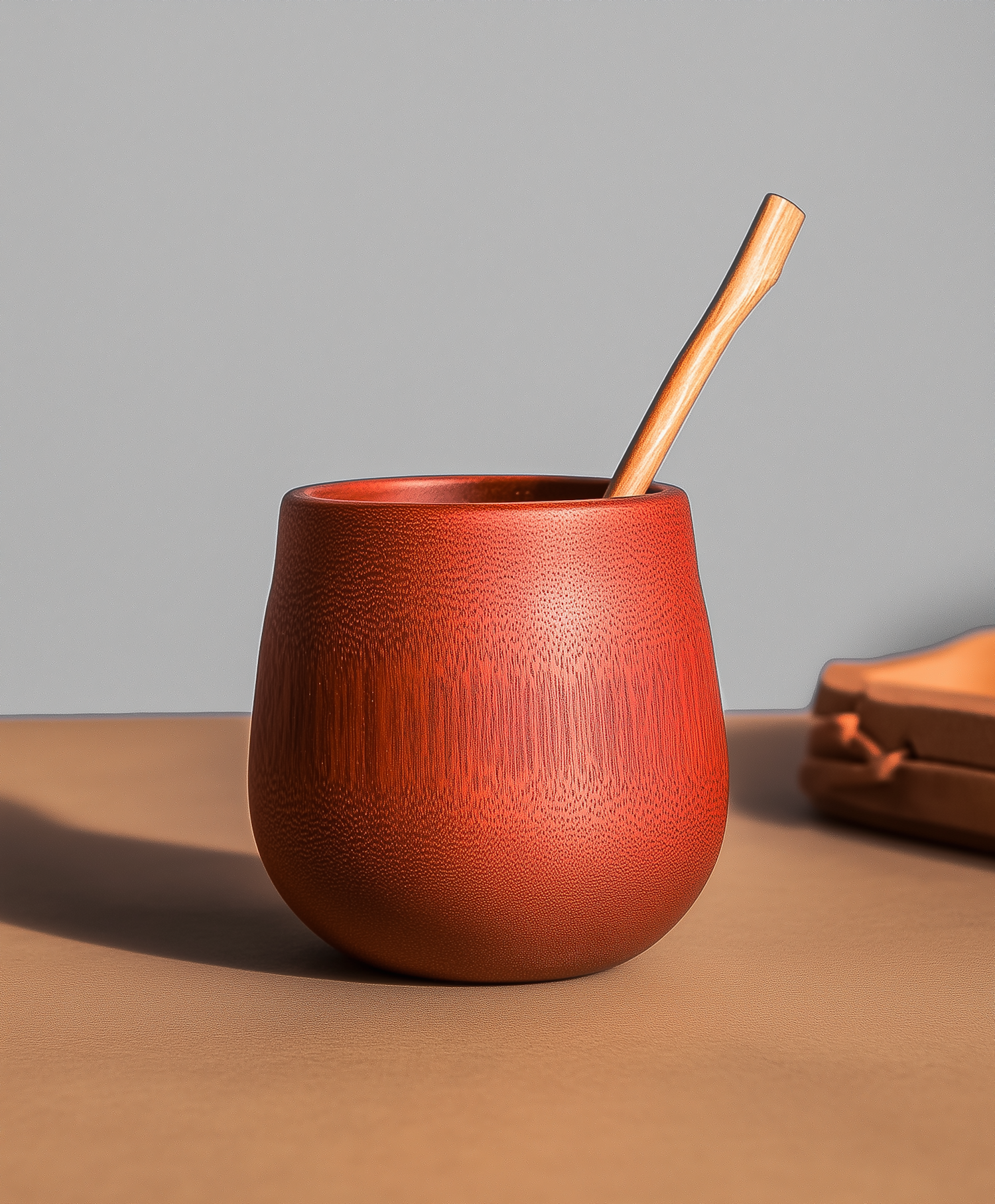 Elegant wooden cup with a reddish-brown finish and matching straw on a minimalist beige surface, perfect for a natural, modern aesthetic.
