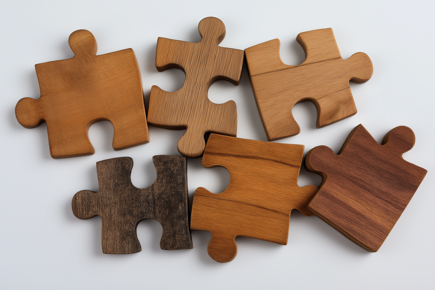 A scattered collection of wooden puzzle pieces of varying wood finishes and grains against a simple, light background.