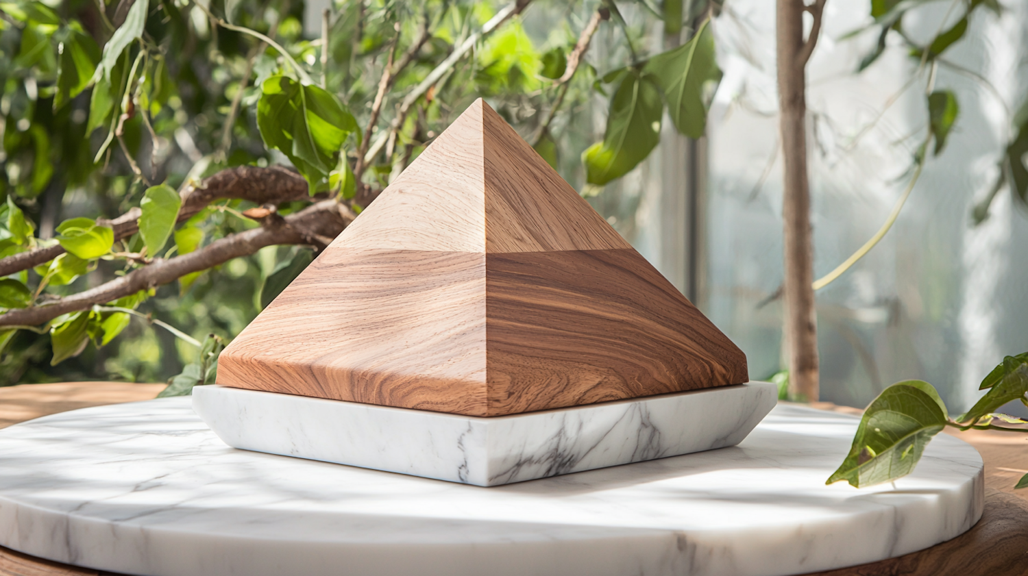 Elegant wooden pyramid on a marble base surrounded by lush greenery, showcasing natural textures and earthy tones.