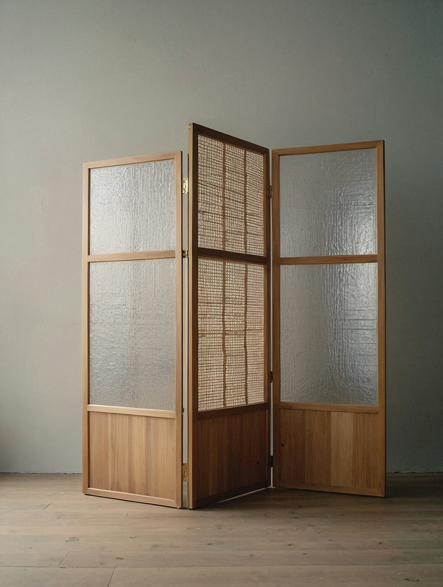 Elegant wooden room divider with frosted glass, rattan, and solid wood panels, perfect for modern or traditional interiors.