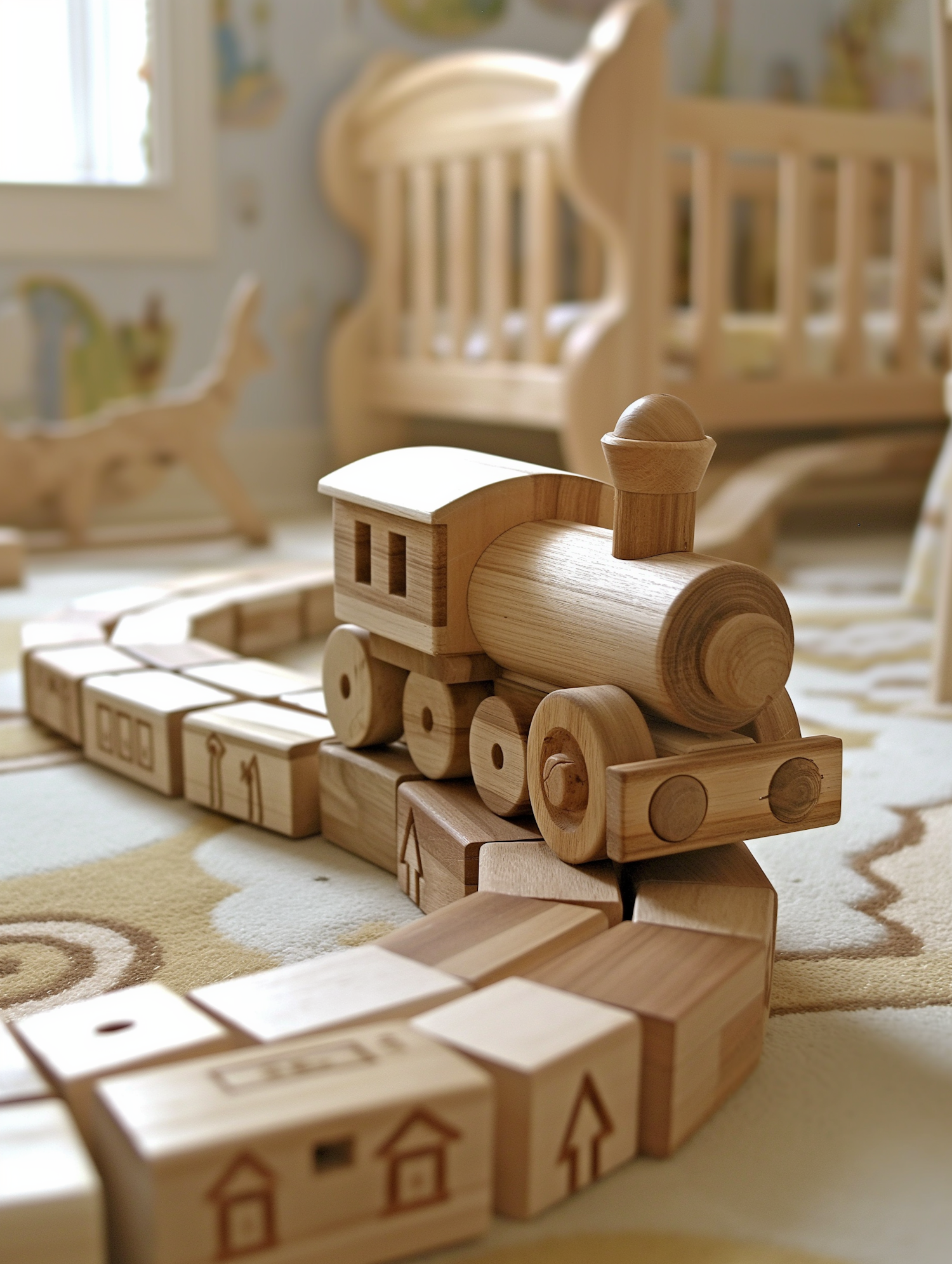 Charming wooden toy train on a block track in a cozy nursery setting, with a wooden crib in the background.