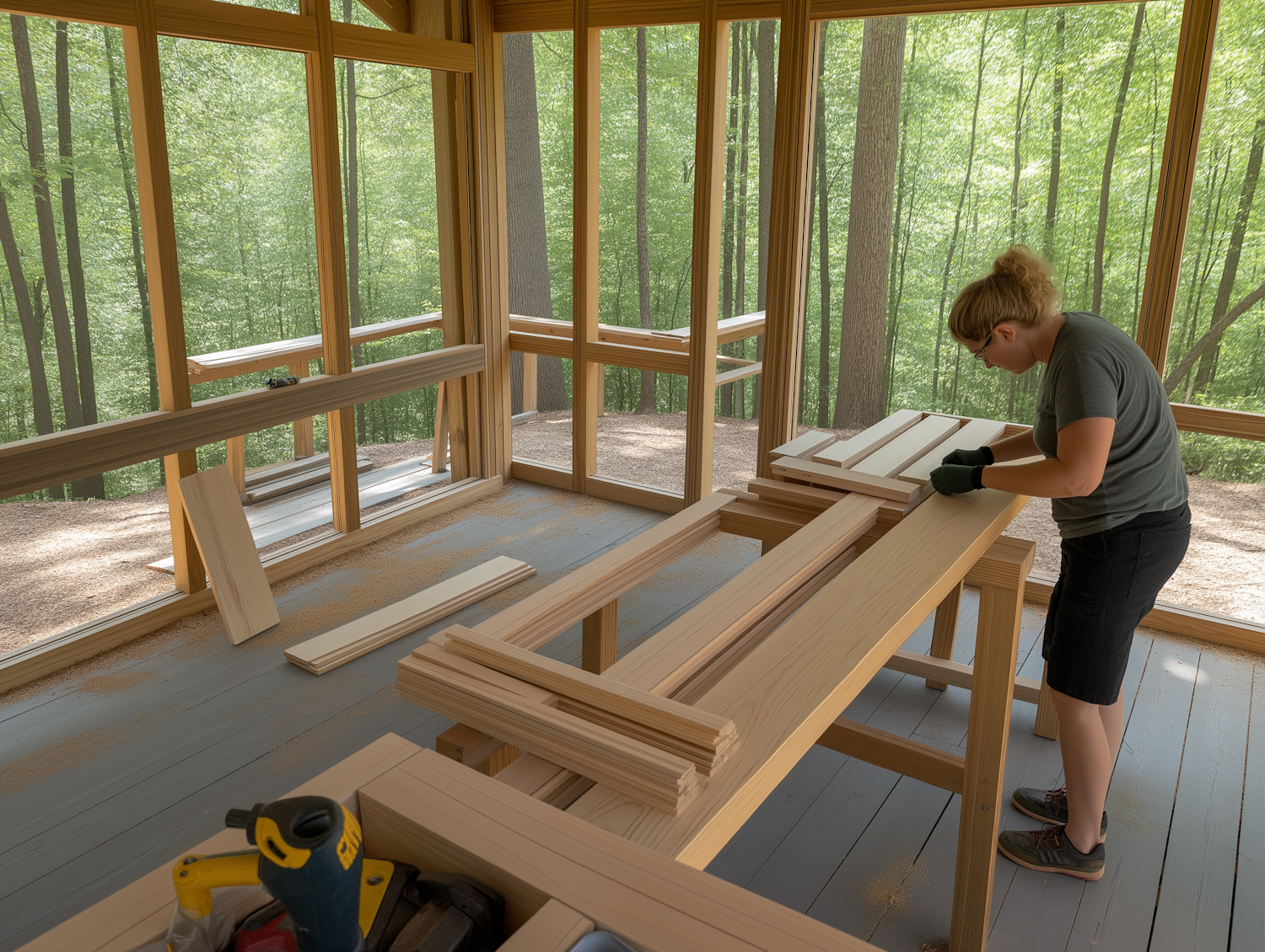 A person working on a woodworking project in a wooden structure surrounded by a forest, with tools and sawdust scattered around.