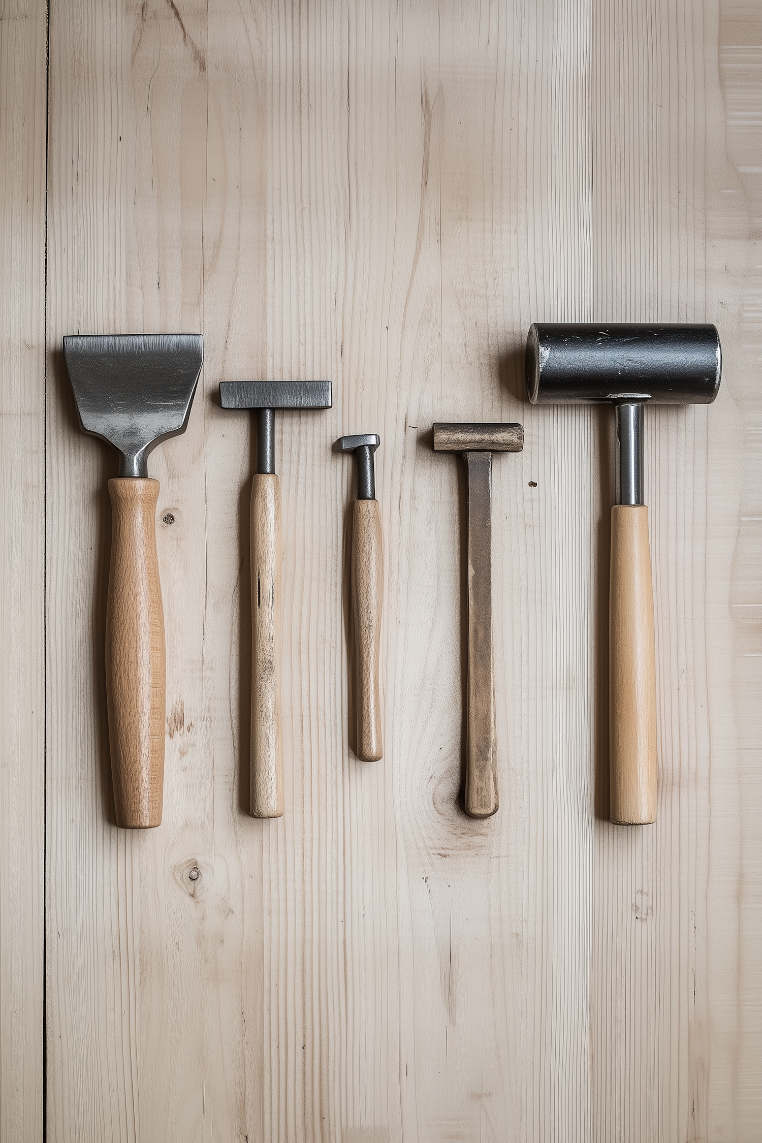 A set of five woodworking tools with wooden handles and metal heads, neatly arranged on a light wooden surface.