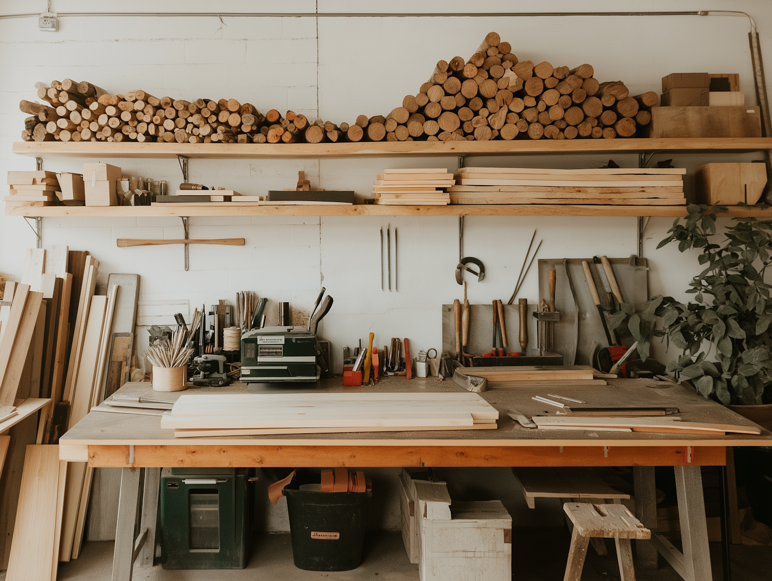 A tidy woodworking workshop with tools, wooden planks, and logs neatly arranged on shelves and a central workbench for crafting.