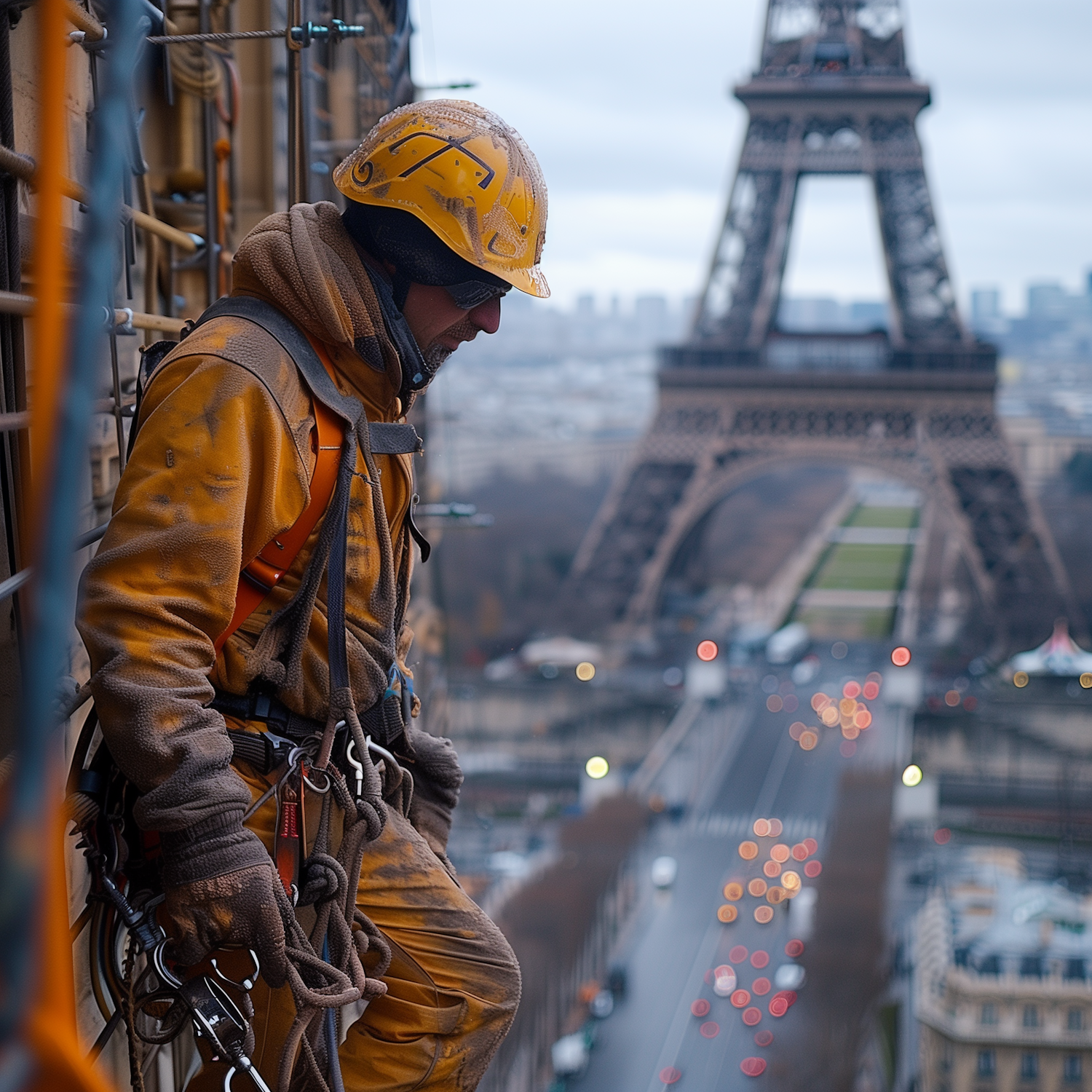 Construction worker in safety gear suspended on a building with the Eiffel Tower in the background, showcasing urban heights and safety.