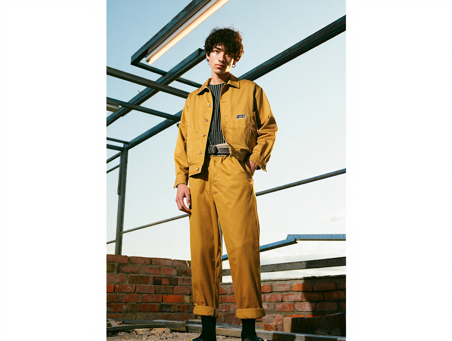 Stylish individual in yellow-brown workwear against minimalist construction framework, evoking modern, industrial, and simple vibes.