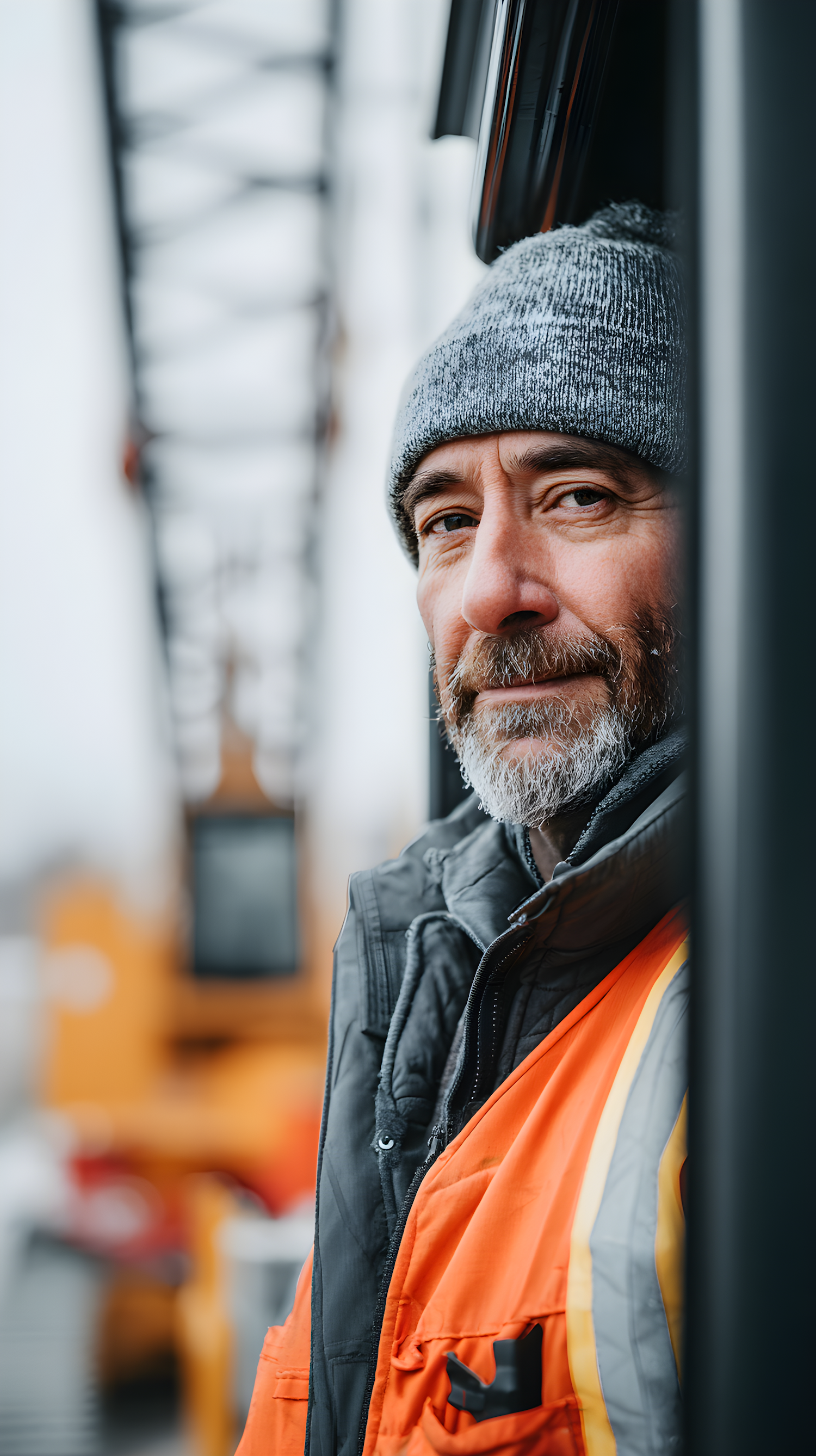 A man in a gray beanie and orange safety vest stands near industrial equipment, with a calm expression on a cloudy day.