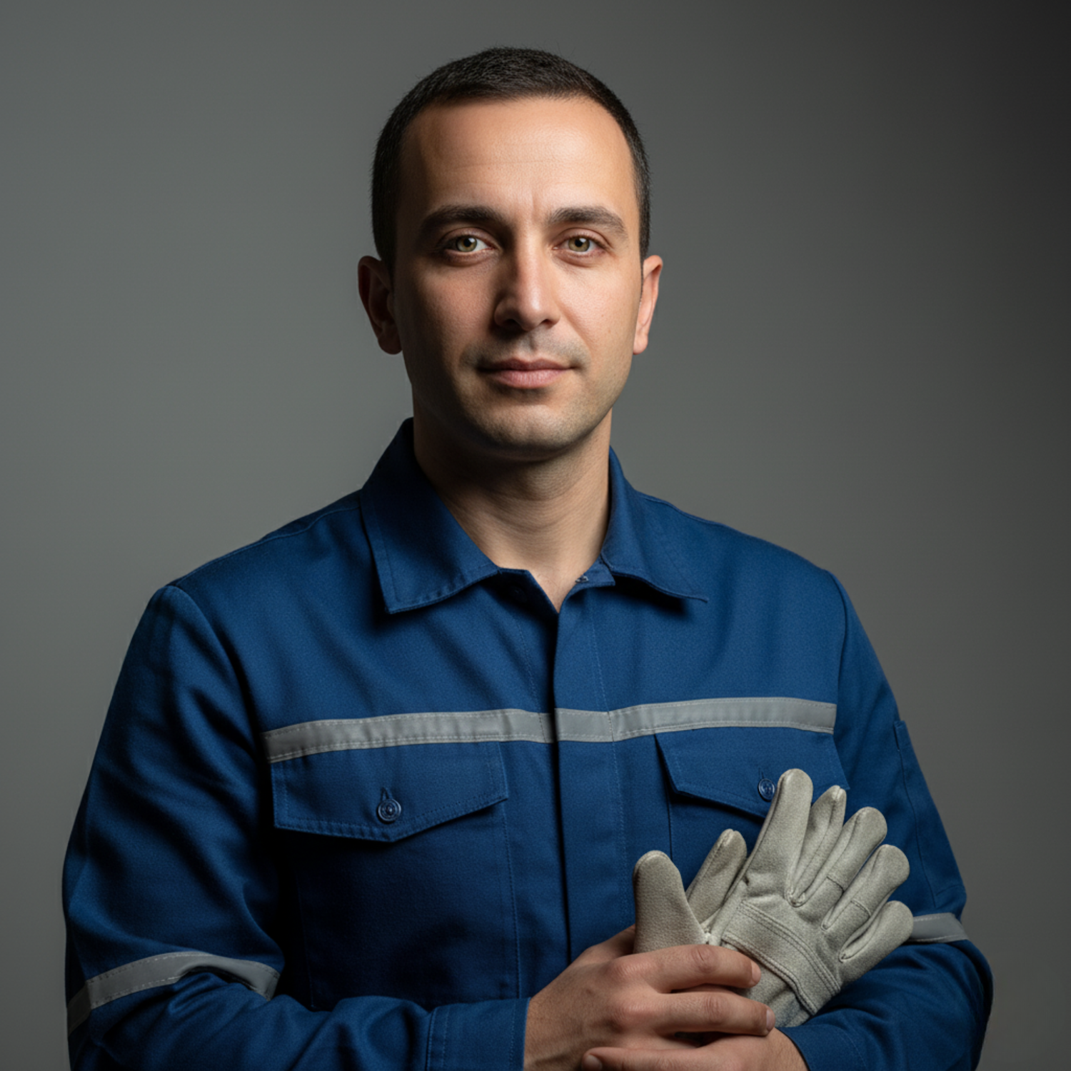 A man in a blue work uniform holding gloves, standing against a neutral background with a calm expression.