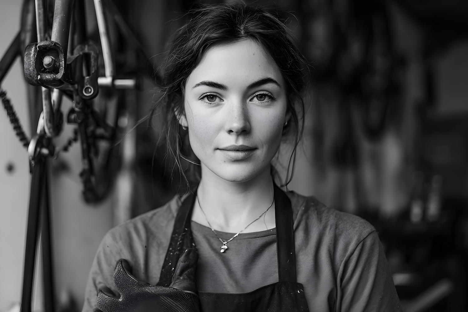 Monochrome portrait of a young woman in a workshop, wearing an apron and a necklace, with a calm expression and tools in the background.