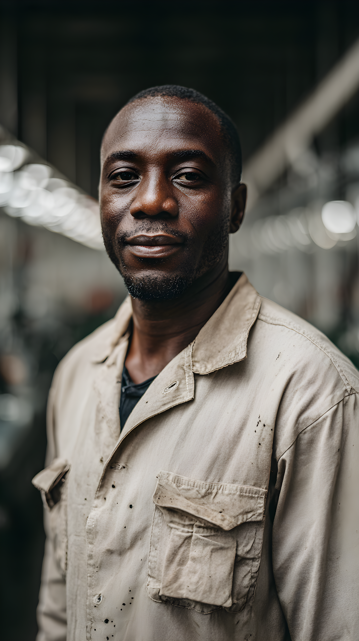 A man in a workshop wearing a beige work uniform, with a calm expression and industrial lighting in the background.
