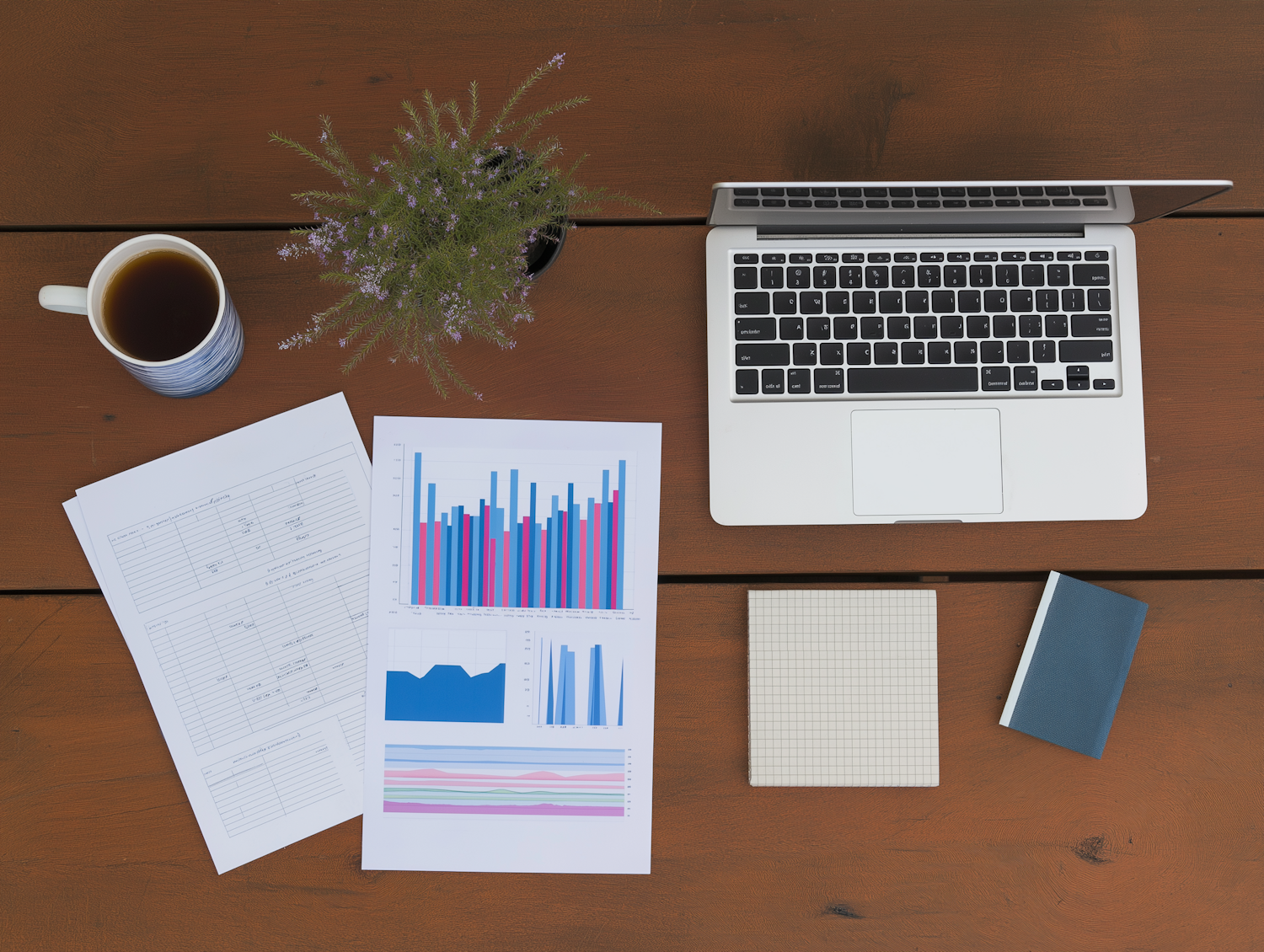 A tidy workspace with a laptop, coffee, documents with charts, a notebook, and a plant on a wooden table, perfect for productivity.
