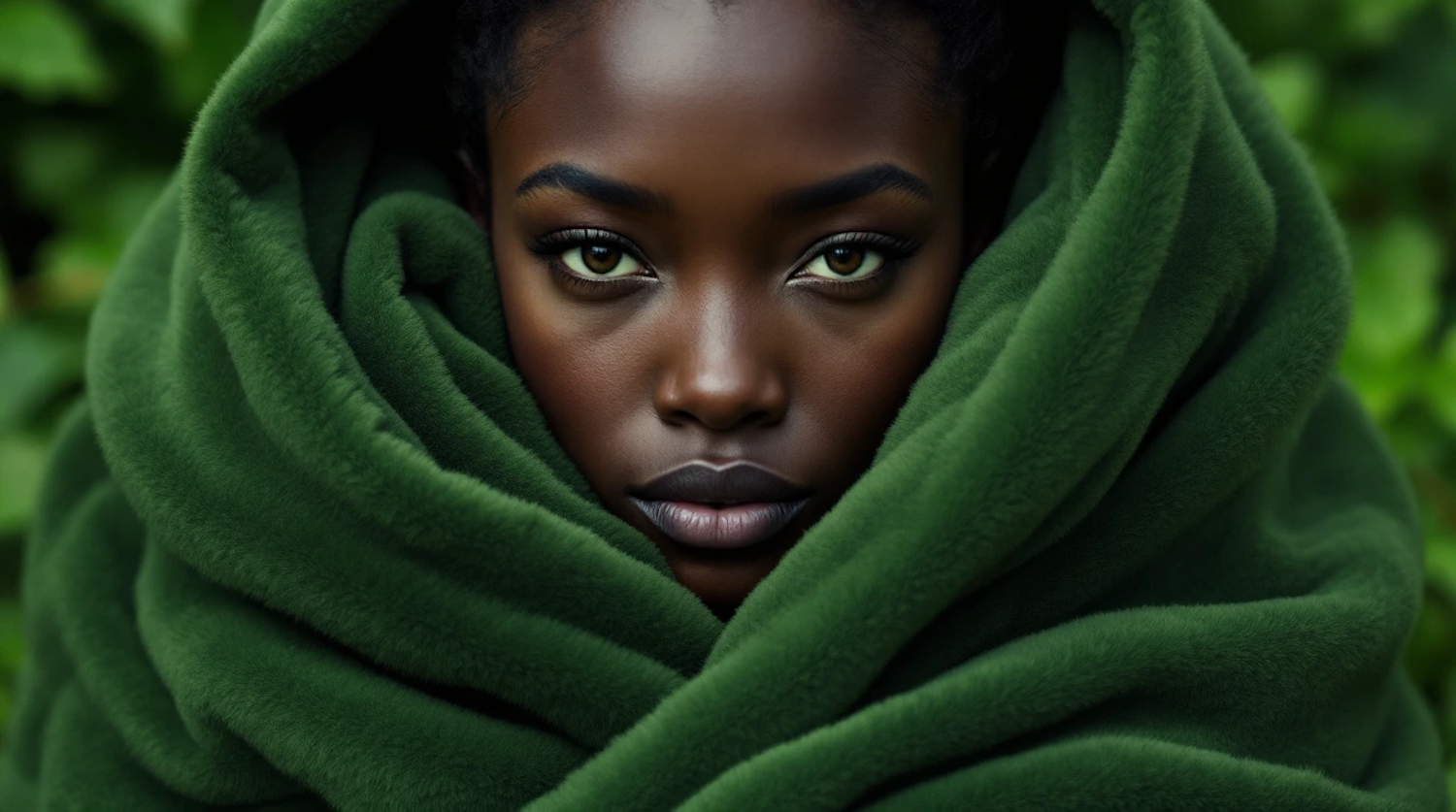 Close-up of a woman with green eyes wrapped in a green blanket, set against a blurred green foliage background.