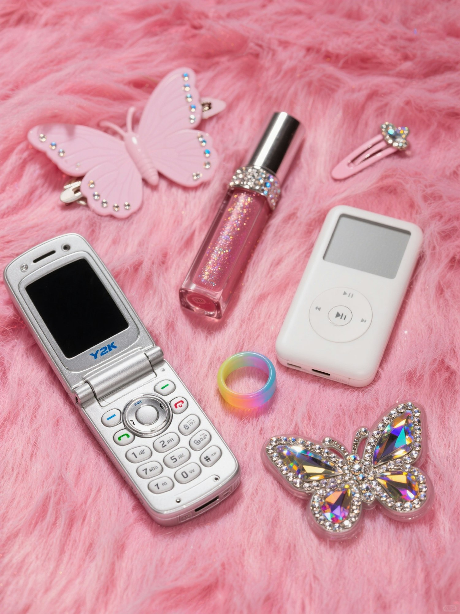 Y2K nostalgia with a flip phone, MP3 player, glittery lip gloss, and butterfly accessories on a pink fluffy background.