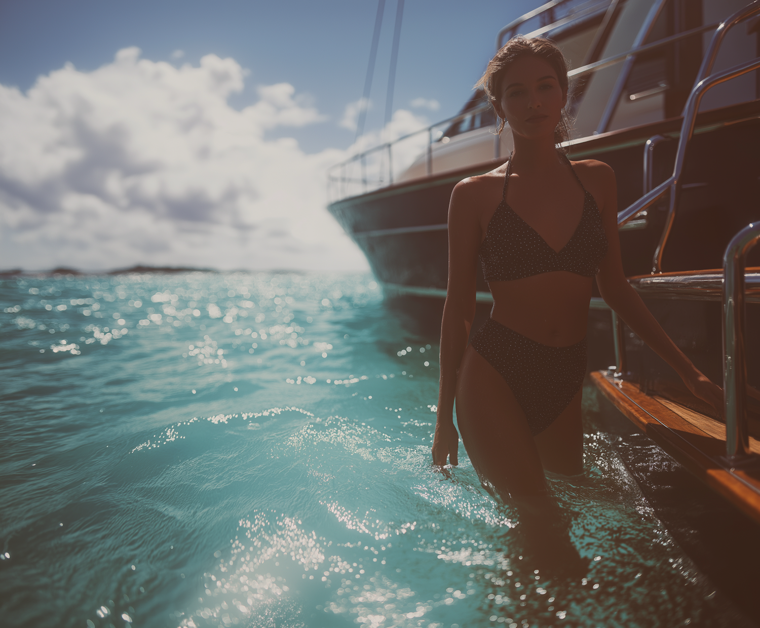 A woman in a polka-dot bikini steps from turquoise water onto a yacht, with sunlight sparkling on the waves and a bright sky overhead.