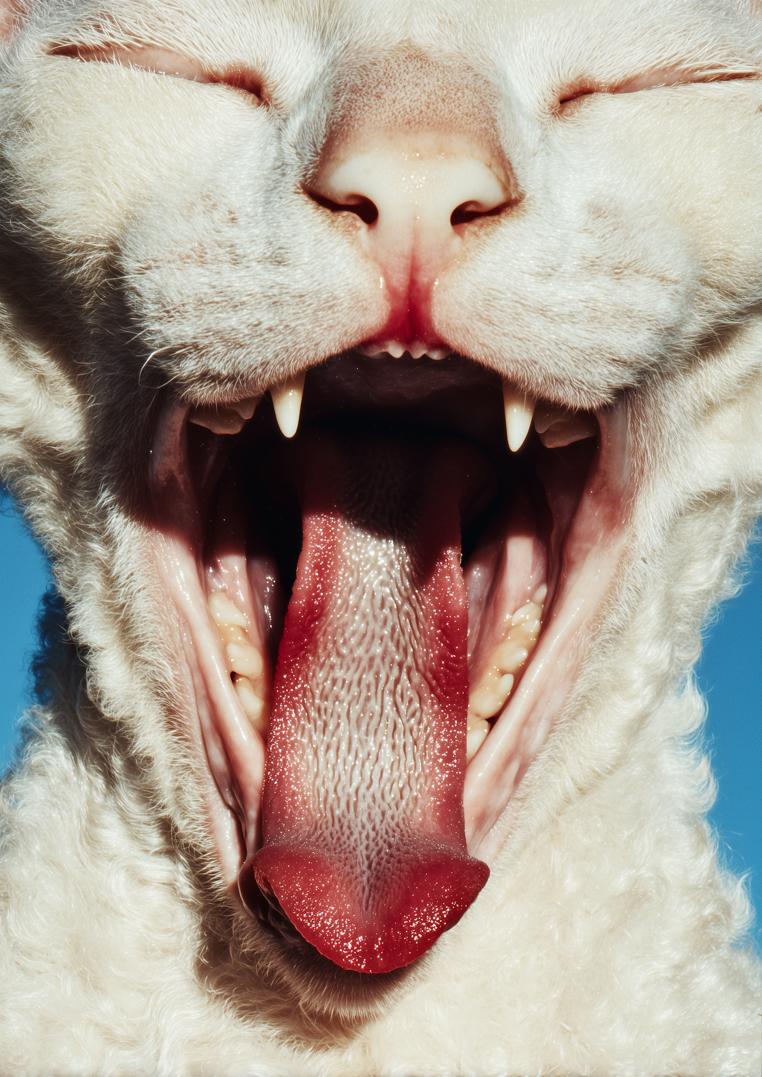 Dramatic close-up of a yawning white cat, displaying detailed textures in its tongue, teeth, and vibrant background contrasts.