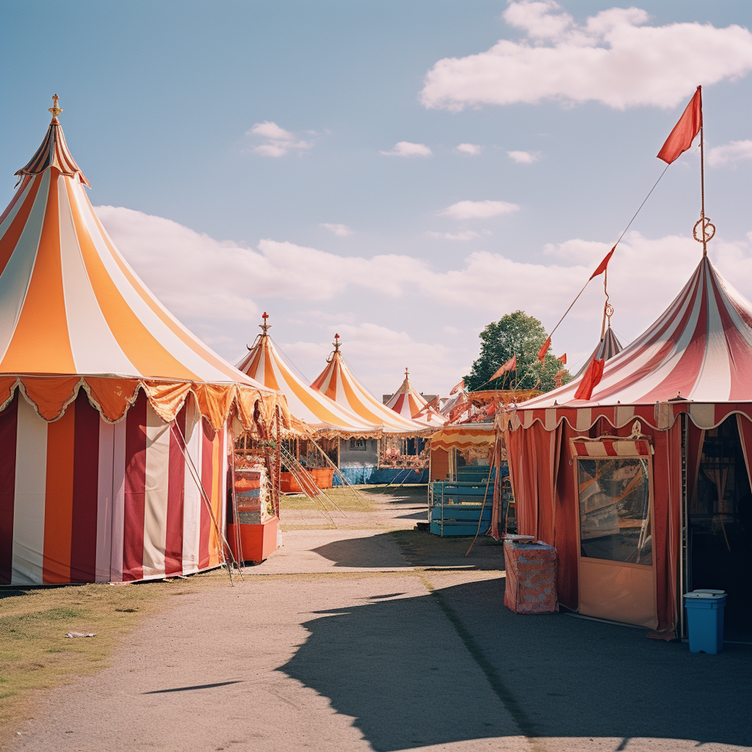 Colorful circus tents with orange and white stripes under a bright blue sky, creating a lively fairground atmosphere.