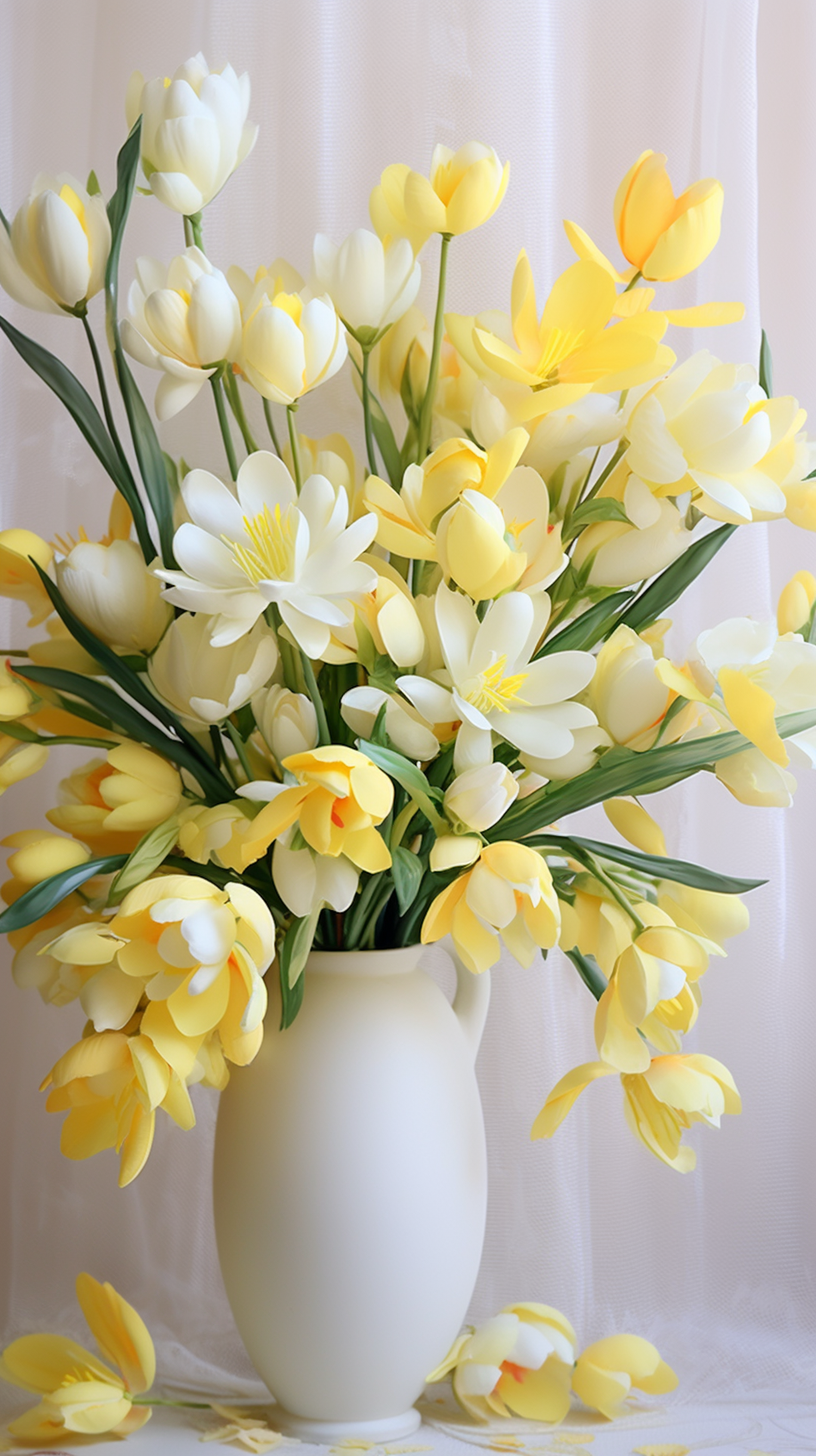 Elegant bouquet of yellow and white tulips in a cream vase, set against a soft fabric backdrop. Perfect for spring decor inspiration.
