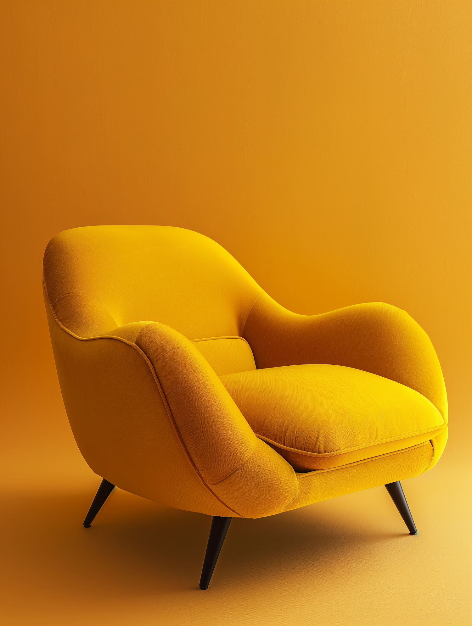 Bright yellow modern armchair with plush cushions and sleek black legs, set against a matching yellow background for a bold aesthetic.