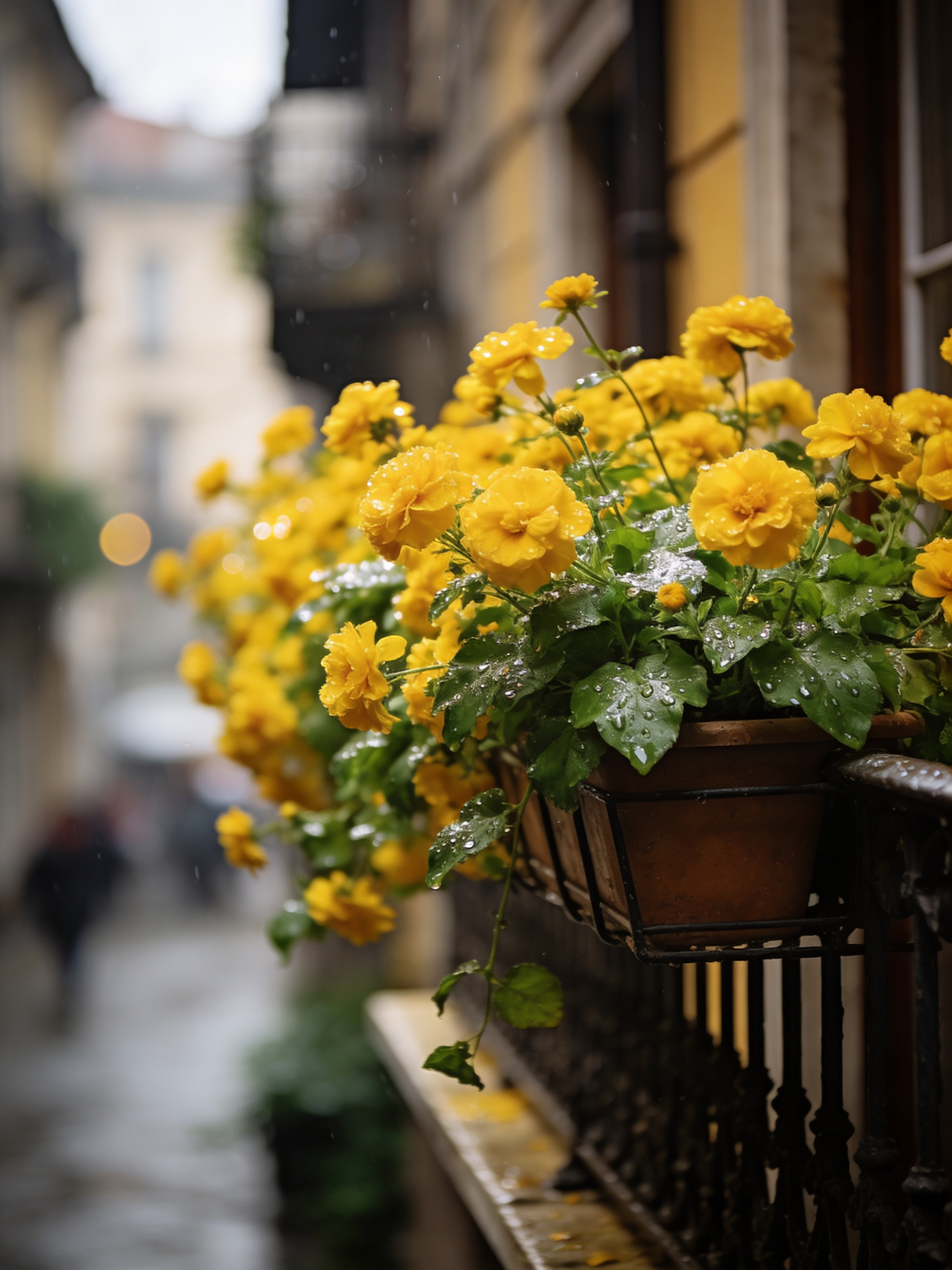 Cinematic street photography, soft overcast daylight, muted building tones, gentle film grain, subtle halation, shallow depth of field, 50mm lens look. Balcony planter overflowing with yellow flowers and damp leaves, quiet street below blurred, warm subtle atmosphere, yellow is the dominant accent. No logos, no readable text, no brand names.