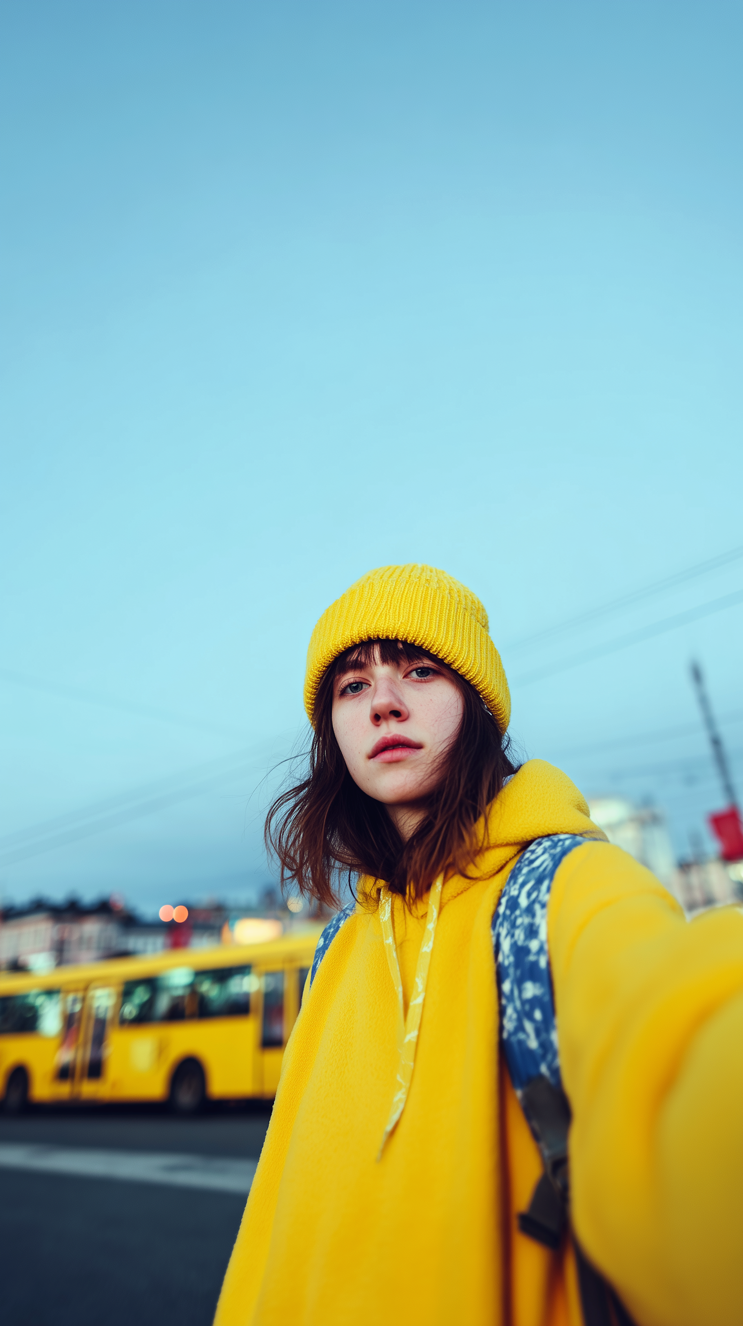 A person in a yellow beanie and hoodie takes a selfie outdoors with a yellow bus and blue sky in the background.