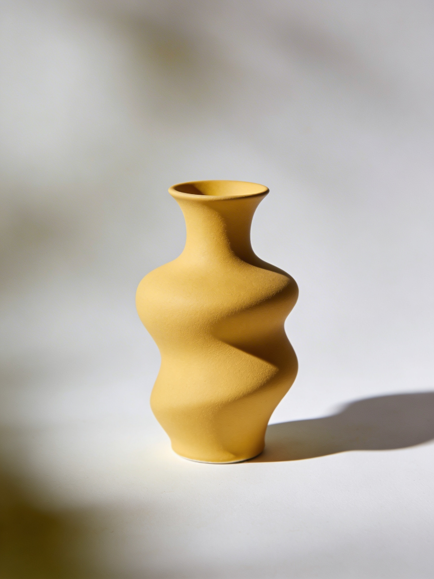 A yellow ceramic vase with a wavy design on a white surface, showcasing its modern and artistic aesthetic with soft lighting and shadows.