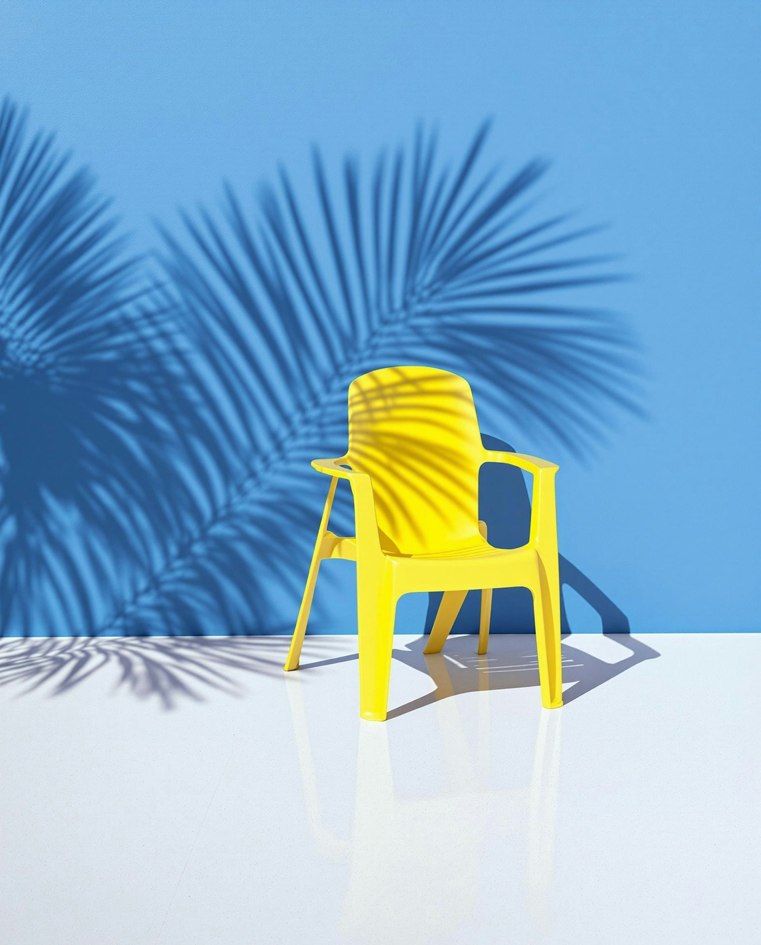A bright yellow plastic beach chair placed alone in front of a bold blue wall. The shadow of a palm leaf falls across the scene. Clean, minimalist composition, strong color contrast, saturated summer ambiance.