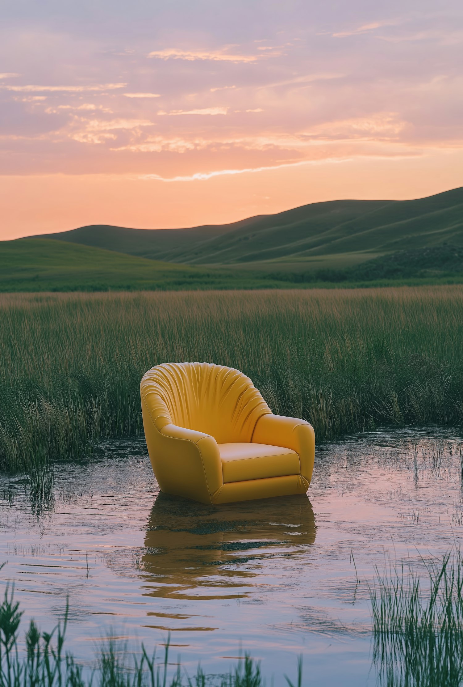 A bright yellow armchair sits in a tranquil wetland, surrounded by tall grass and reflecting water, under a pastel sunset sky.