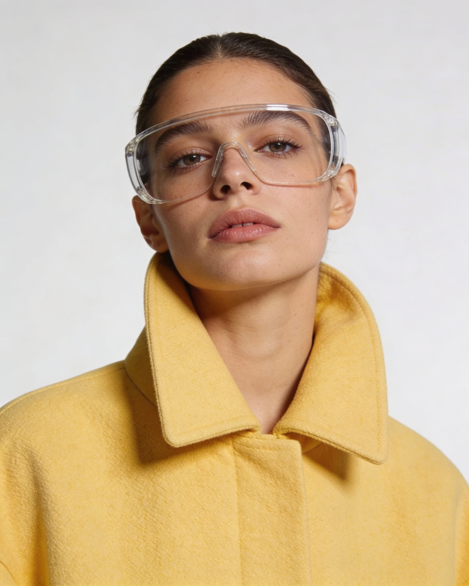 Ultra-realistic fashion lookbook photo, tight portrait close-up on a matte off-white studio seamless, outfit: lemon-yellow oversized coat (collar visible), prop: transparent safety goggles worn on the face (clean, unbranded), pose: direct gaze, chin slightly lifted, soft but contrasty studio lighting, crisp skin + coat texture, 85mm look, shallow depth of field, clean editorial grading, no logos, no text, no watermark.