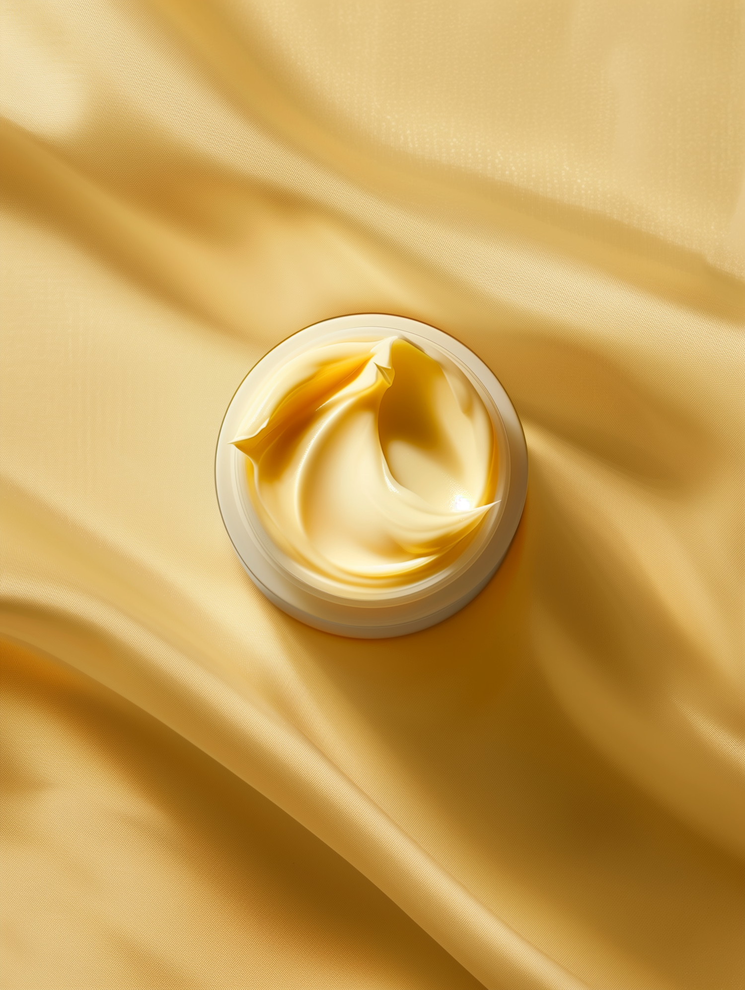 A top view of a circular container holding light yellow cream, placed on softly wrinkled yellow fabric, creating a harmonious aesthetic.