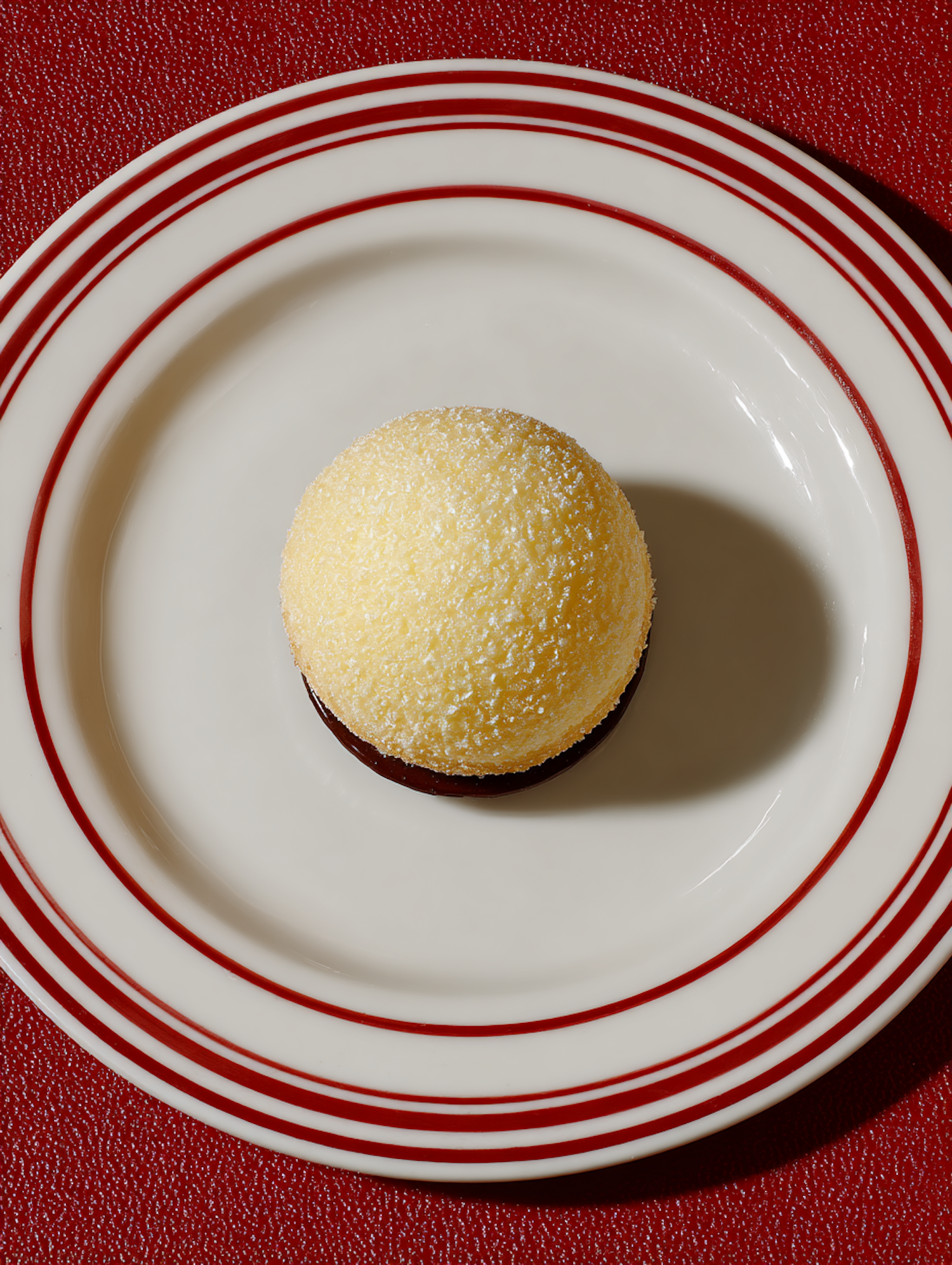 A yellow sugar-dusted dessert with a chocolate base on a white plate with red stripes, placed on a red textured surface.
