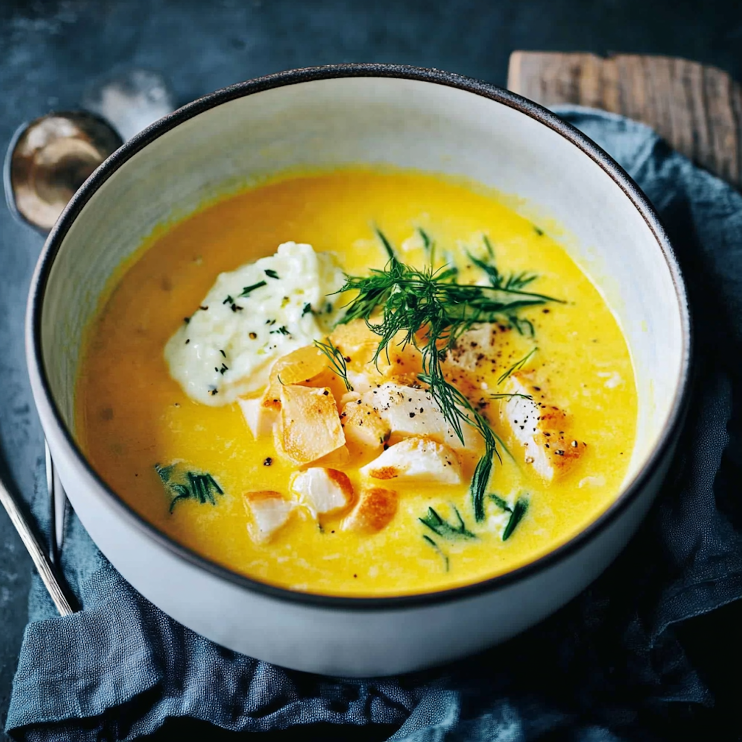 A vibrant yellow soup with seared fish chunks, fresh dill, and a dollop of cream served in a ceramic bowl on a dark blue cloth.