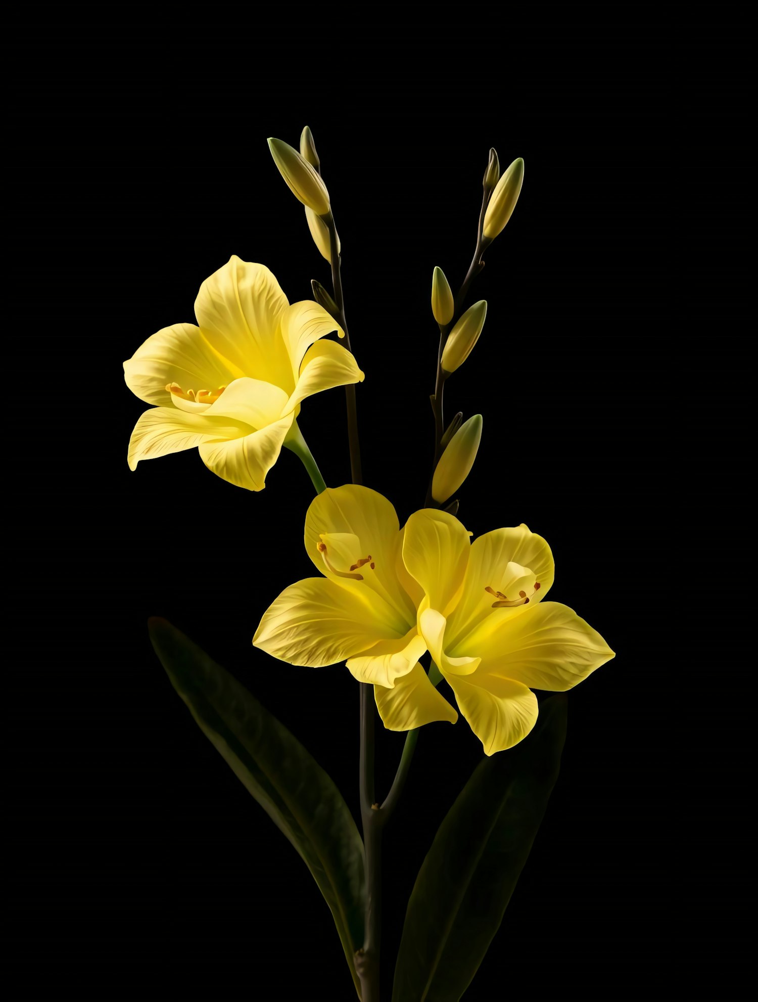 Bright yellow flowers with delicate petals and green buds on a black background, showcasing nature's beauty in vivid detail.