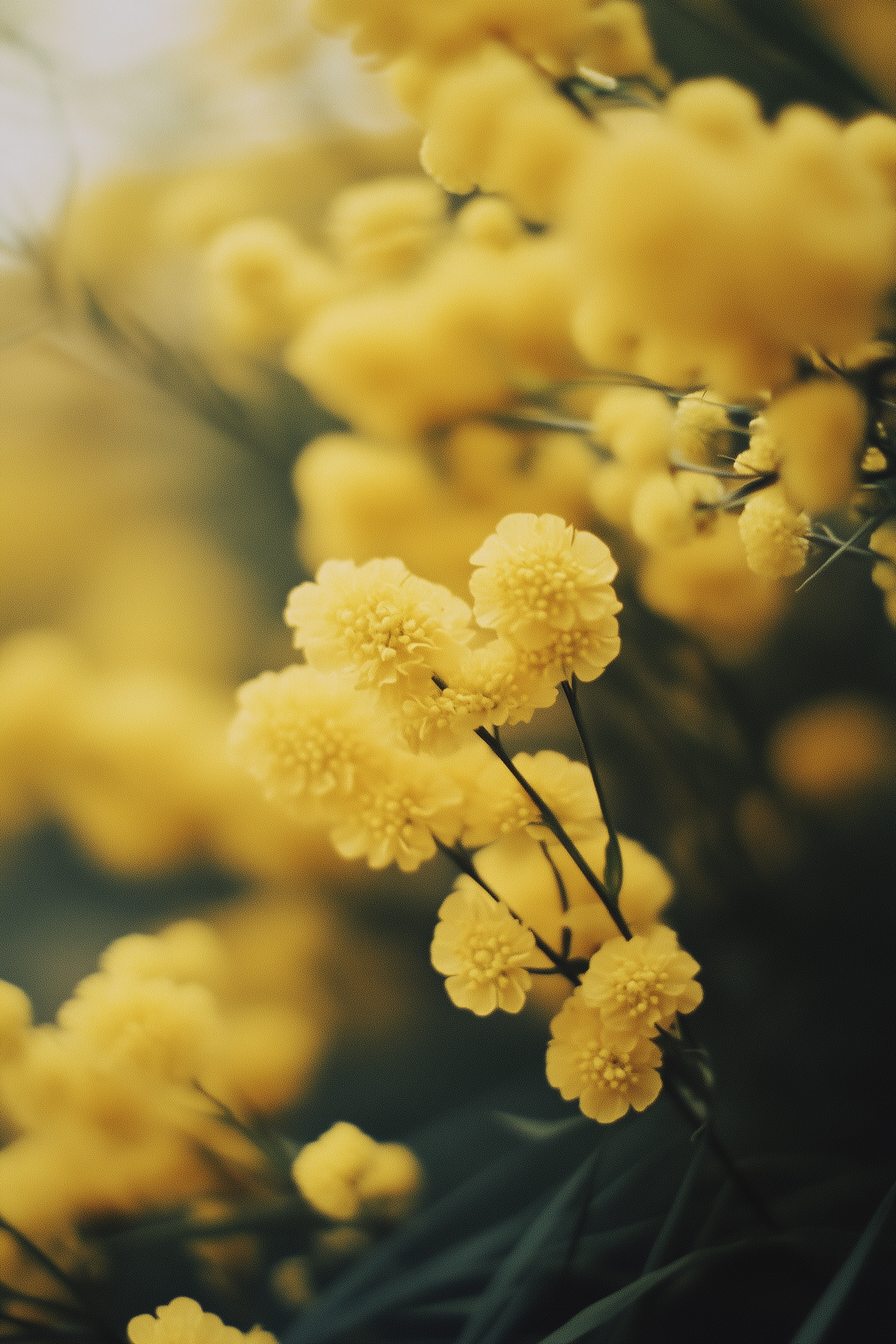Close-up of vibrant yellow flowers with soft petals on green stems, set against a blurred bokeh background for a serene, natural vibe.