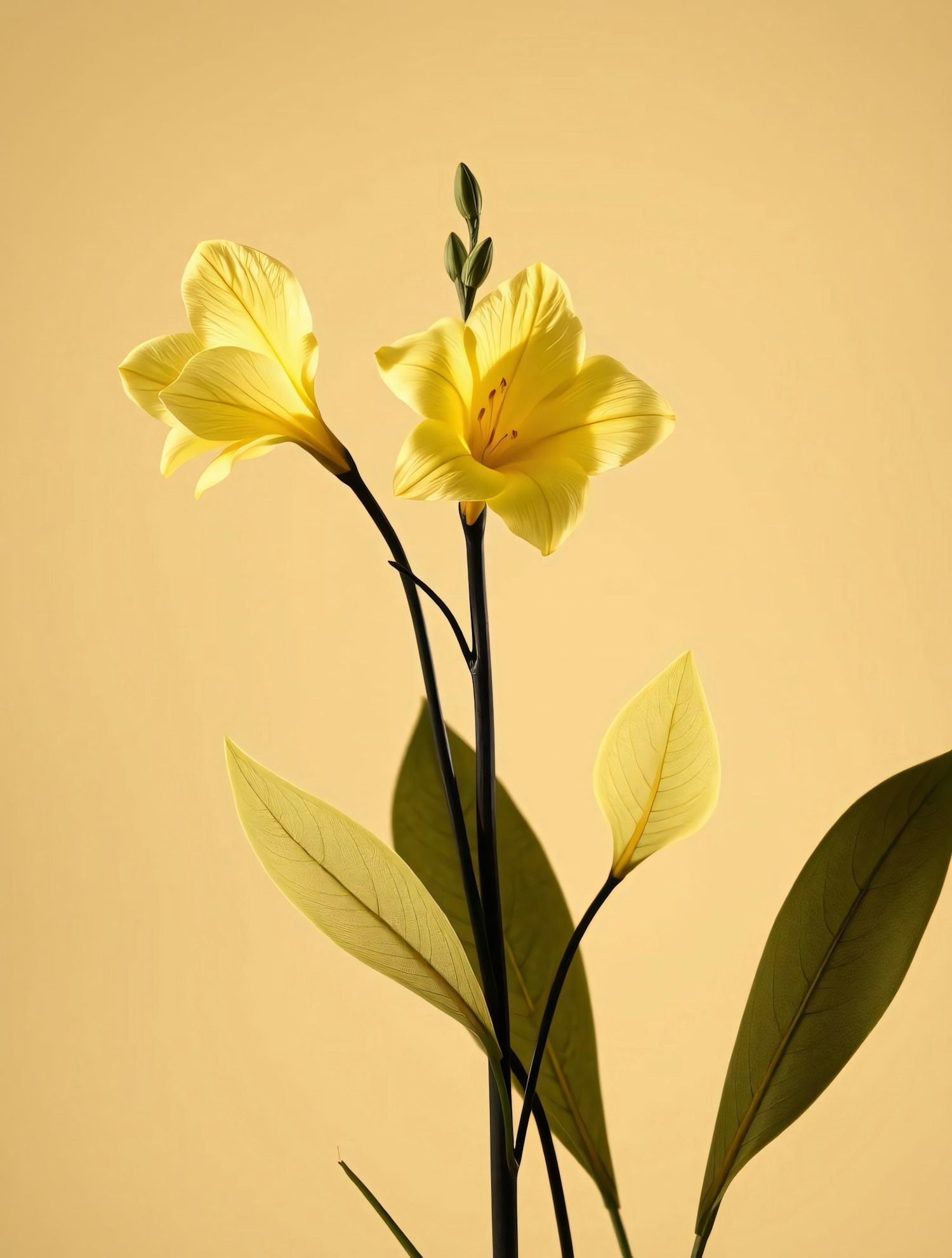 Bright yellow flowers with green leaves on a soft yellow background, creating a minimalistic and elegant floral composition.