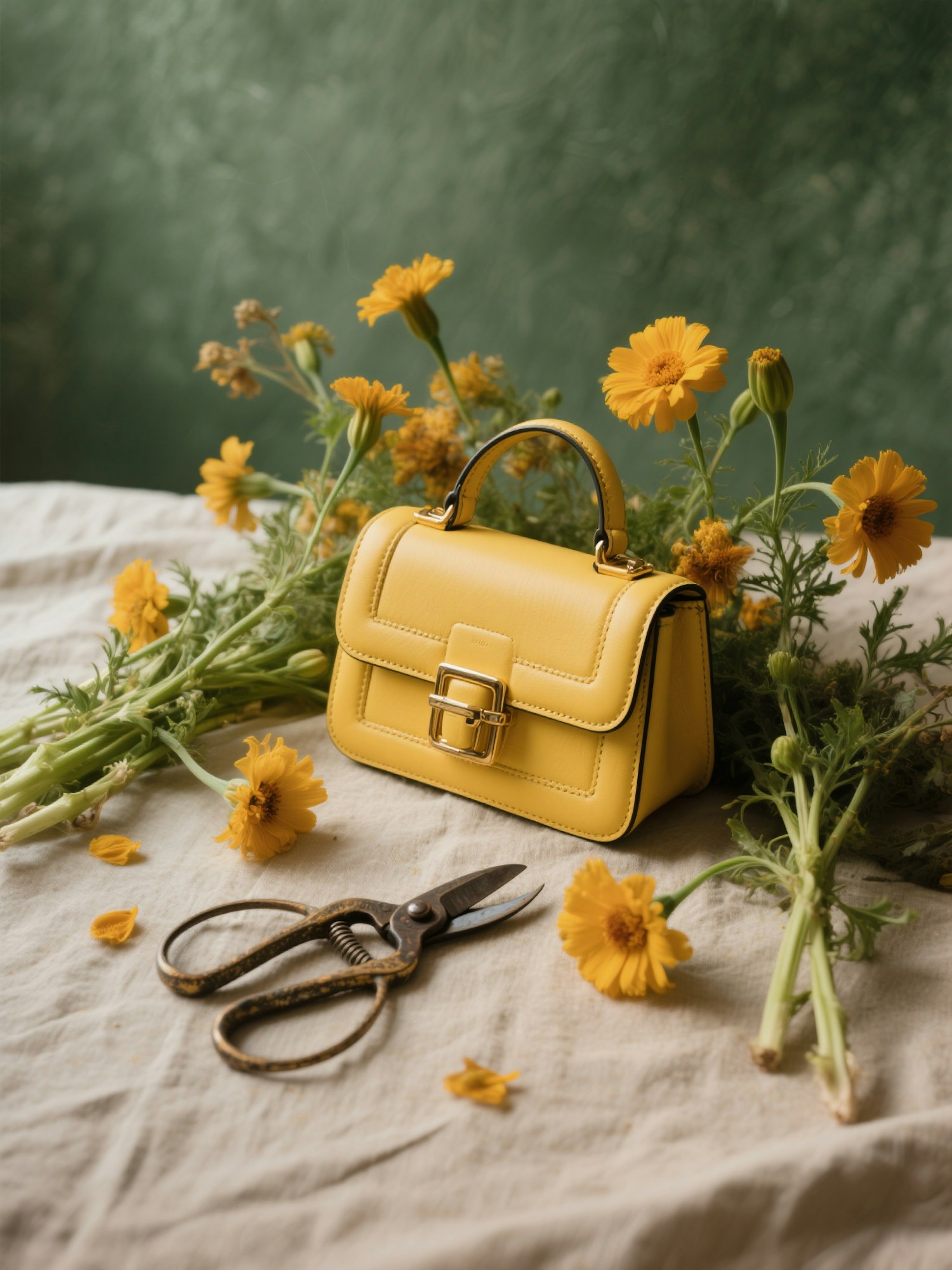 studio product photography of a handbag staged like a luxury fashion campaign, elegant floral composition, soft natural lighting, vintage still life setup, warm tones, flowers coming out of or surrounding the bag, green textured background, editorial style, 50mm lens, medium shot + a small yellow handbag laying flat on a linen cloth with garden shears and calendula stems around