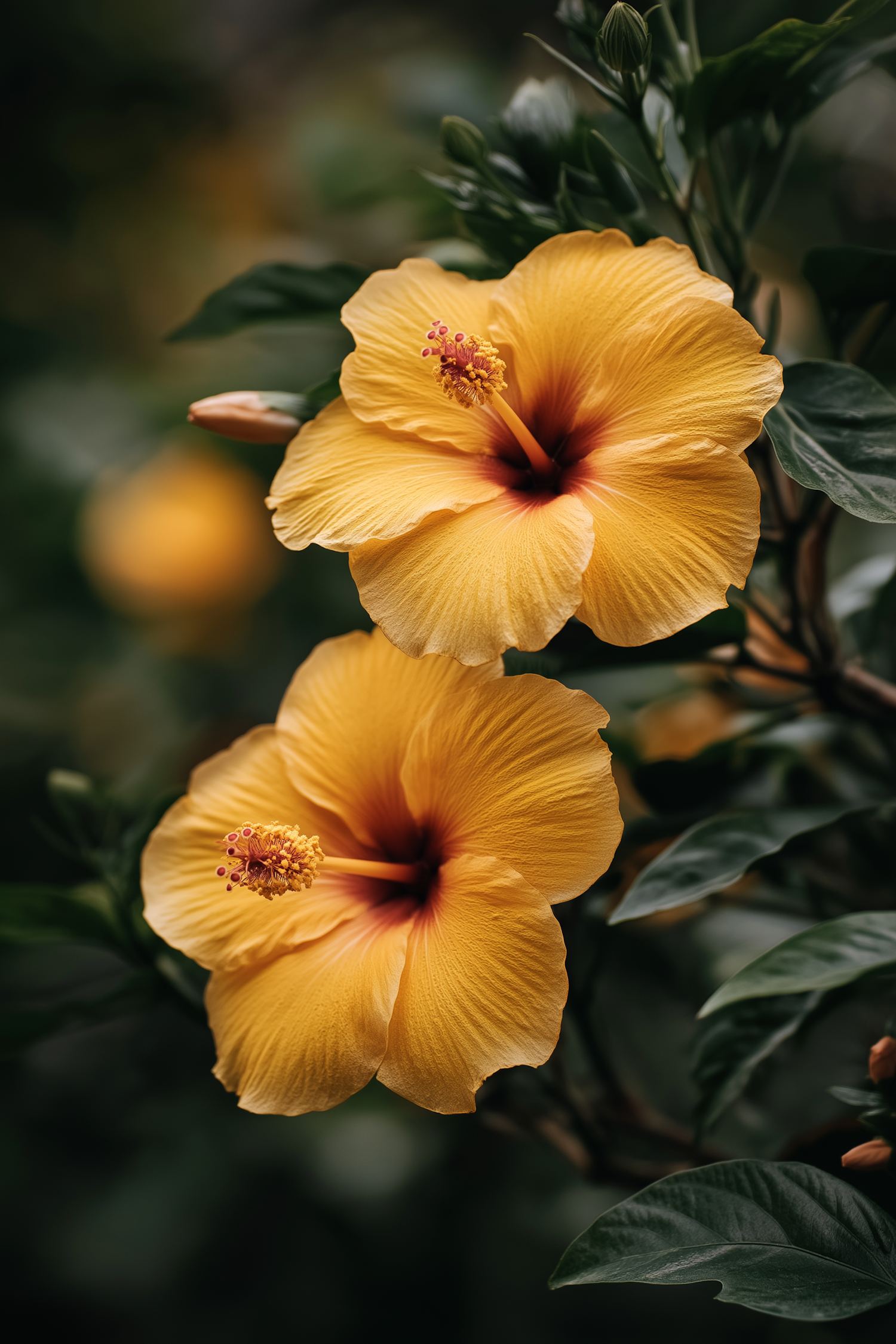 Fresh yellow hibiscus flowers with vivid red-centered and pollen-laden stamens, surrounded by lush green foliage for contrast.